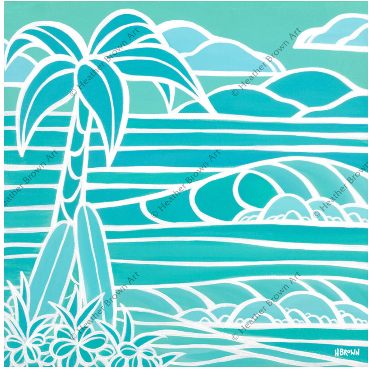 Monochromatic Teal Seascape - Open Edition Canvas Art Print North Shore Oahu surf artist Heather Brown imagines a Hawaii landscape, including a palm tree, surfboards, and the rushing ocean, in shades of turquoise. The cool, calm colors of this piece evoke the tranquil ocean. This is an Open Edition print that can be bought individually or as a set of 9. Shades...