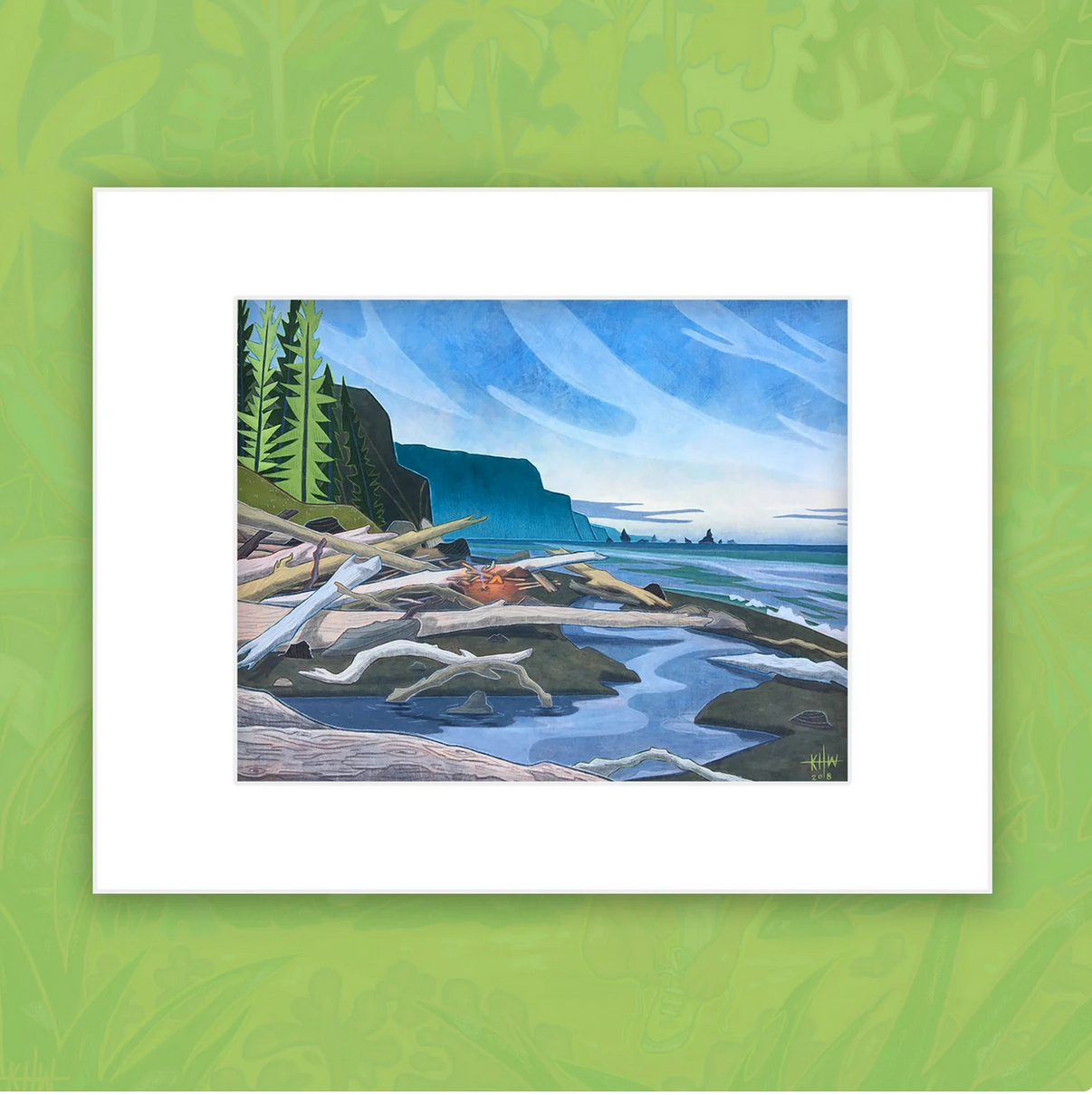 "Third Beach" Matted Fine Art Print Size: 11x14(Original illustration was created in 2018, 12x16” acrylic, colored pencil on wood panel)This illustration was inspired by a beach in Forks, Washington, where the washed up driftwood is full grown trees eroded away from the earth. We hiked 1.5 miles through Olympic National Park, and set up camp in a maze of fallen...