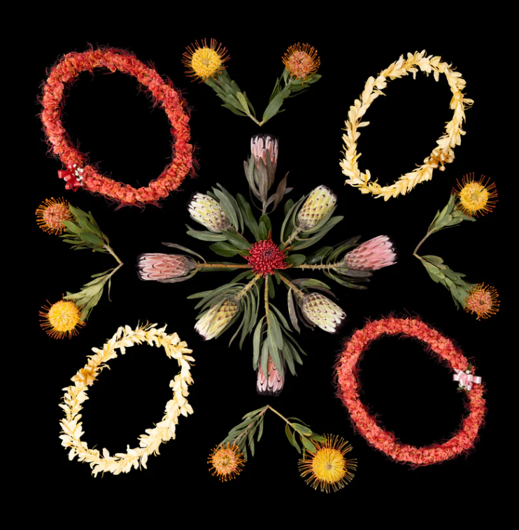 "Ali'i" - Oct. 22 Collection In the depths of a black canvas that echoes Hawaii's volcanic stone, fresh island blooms come together. White kahili ginger lei creates pathways of light, while deep red ohai ali'i lei pop with color at key points in the design. Protea flowers anchor the composition, their distinctive forms adding depth and intrigue. Print :...