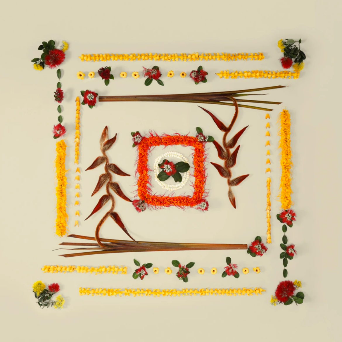 Flowers in Image : Puakenikeni Lei, Ohia Lehua, Fuzzy Hanging Heliconia, Hala, Pikake Lei, Ohai Ali'i