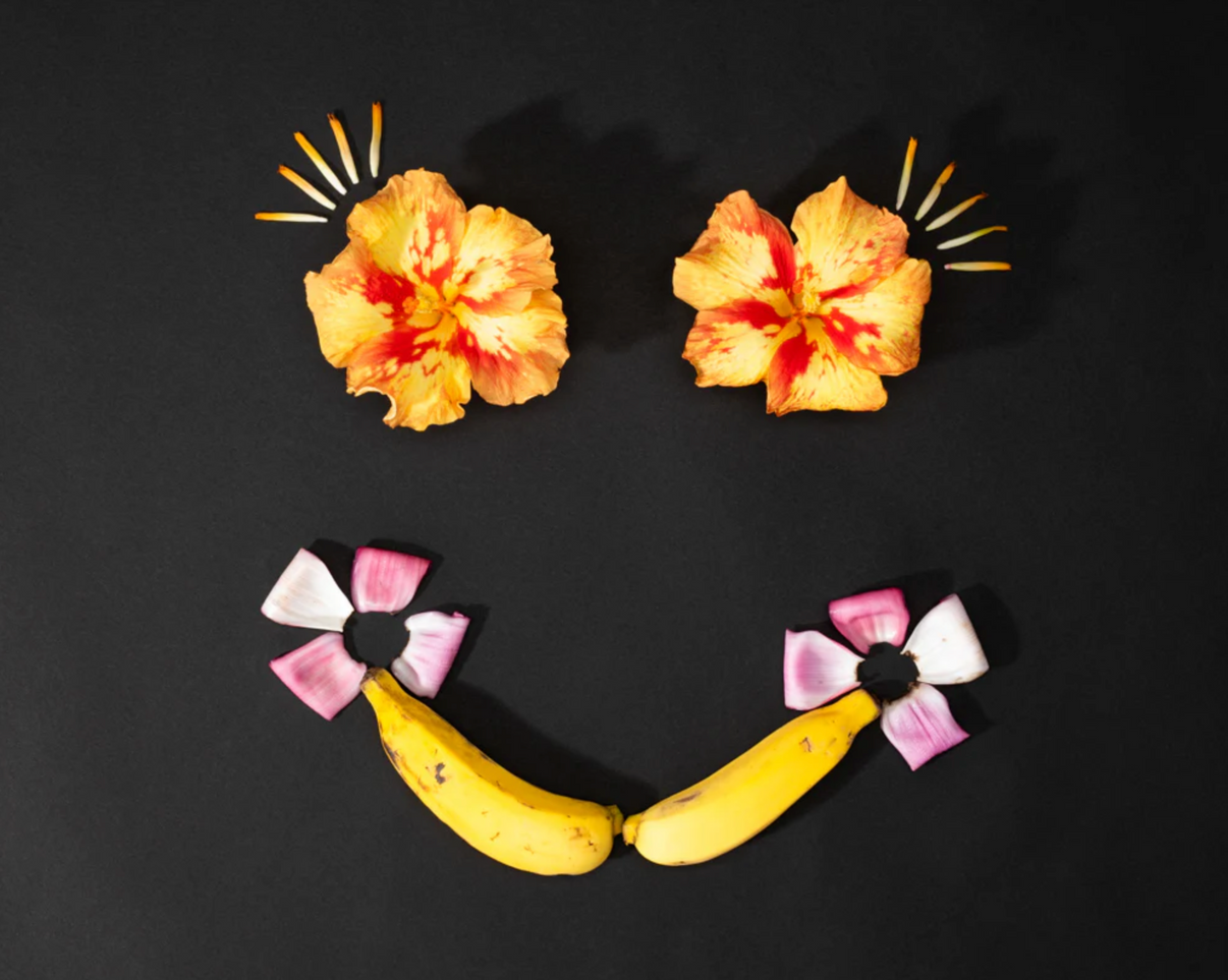 "Smile" Happy Face Ingredients:  sun splash hibiscus, apple bananas, and musa ornata ornamental banana parts as they eyelashes and rosey cheeks.   Print : Giclee Medium : Paper   Matted Size : 11x14" / Mat Opening : 8x10"   *Please allow for a possible production time of 2-3 weeks, before packing & shipment.