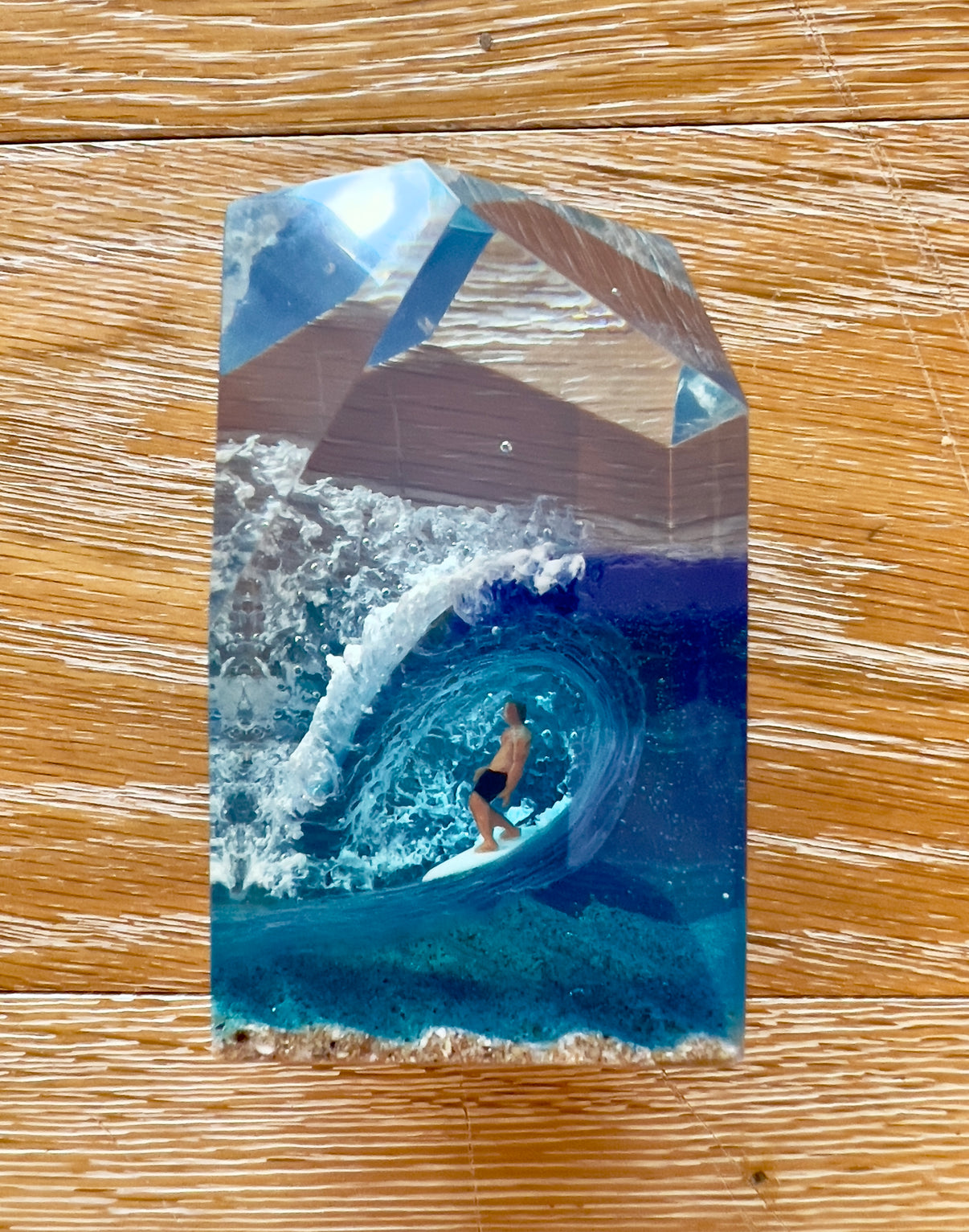 ブランド名のAumbak (オンバク)は、インドネシア語で「波」を意味するombakの略称です。すべては波です。Aumbakはコンセプトです。 この作品はサーファーとサーフボードと波が一体となる瞬間を捉えた作品です。 乗り手の精神を表す波の上のダンスをこの小さな世界で表現します。 手にした人がサーフィンを体感できるよう、一つ一つ丁寧に手作りしています。 サーファーなら誰もが持つ波に乗る喜び、そしてその瞬間の感情がクリスタルキューブに閉じ込められています。クリスタルキューブを傍らに置くことで、様々な感情を無意識に統合することができれば、あなたのミッションは成功です。 製品寸法: 長さ2インチ / 幅2インチ / 高さ3.5インチ サーファーと板と波が一体となった瞬間を切り取る波、様々な種類の板、 サーファーのスタイル、ライダーの精神が表現される波上でのダンスをこの小さな世界で表現。 手に取った人がそこからサーフィンの何かを感じられるよう丁寧に手作業で制作しています。 サーファーであれば誰もが持っている波に乗っている特別な喜び、その瞬間の感情がクリスタルキューブに閉じ込められています。 クリスタルキューブを側に置いて、さまざまな感情を無意識に統合することができればミッションは成功です。