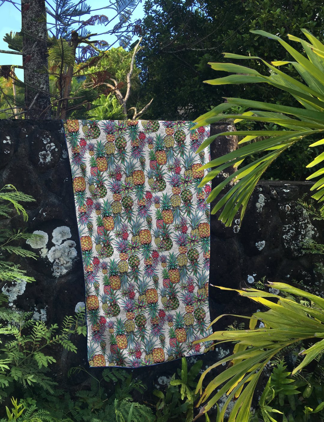 SURFER TOWELは、地元ハワイのデザイナー、クリスティ・シンと再びタッグを組み、「アロハ・パイナップル」を制作しました。様々な形や大きさの、みずみずしいパイナップルをモチーフにした、摘みたてのパイナップルプリントです。このプリントは、一つひとつの要素を手描きし、デジタル技術で織り込むことで、色とりどりのパイナップルが無限に広がるフィールドを作り上げています。