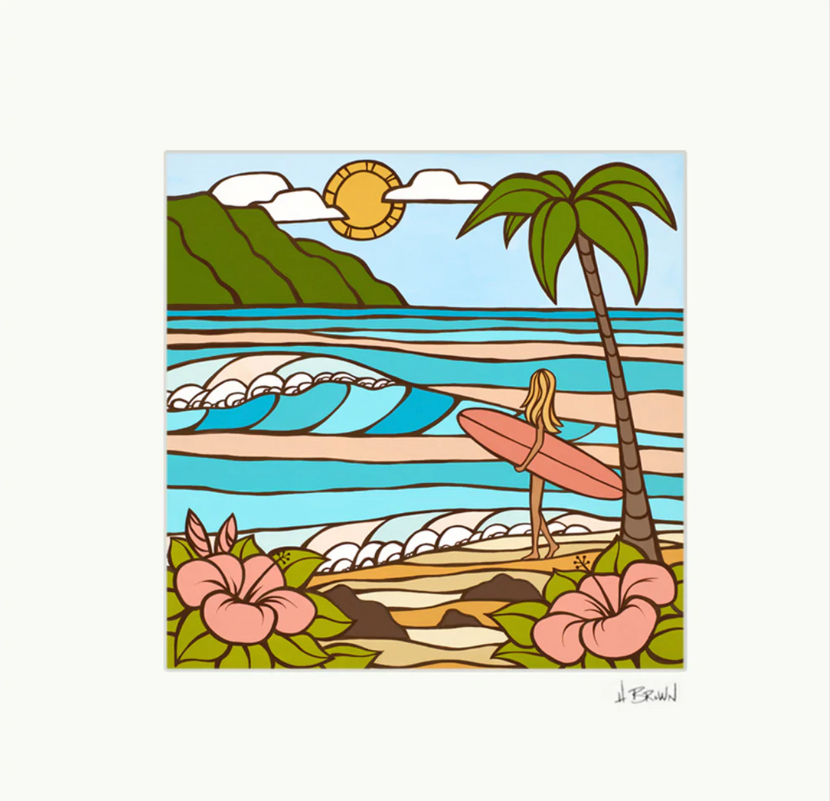 ハワイの夏の日に、太陽が輝くビーチに打ち寄せるうねる波を描いた、ヘザー・ブラウンによるマット加工のアートワーク。オアフ島ノースショアのサーフアーティスト、ヘザー・ブラウンによるマット加工のプリントです。