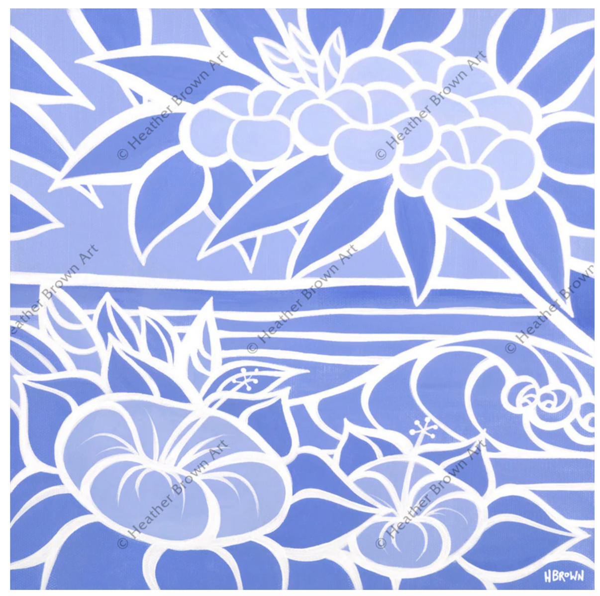 ハワイの花、プルメリア、ハイビスカス、そしてトロピカルフラワーを描いた、夕焼けのような紫色のキャンバスアート作品です。ハワイ出身のアーティスト、ヘザー・ブラウンによるこの作品は、涼しげなブルーとパープルが、トロピカルフラワーと打ち寄せる波に囲まれたハワイのビーチへと誘います。ヘザーの「Shades of Hawaii」シリーズの第7弾です。オープンエディションの作品で、単品または9枚セットでご購入いただけます。