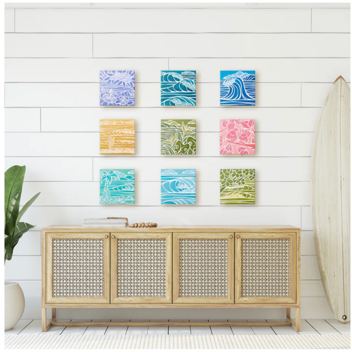 ハワイのサーフアーティスト、ヘザー・ブラウンは、ブルーの色合いを通して、完璧なサーフィンの日を想像します。これはヘザーの「Shades of Hawaii」シリーズの第8弾です。うねる波の涼しく穏やかな色合いは、どんなお部屋にも安らぎを与えてくれます。このプリントはオープンエディションで、単品または9枚セットでご購入いただけます。
