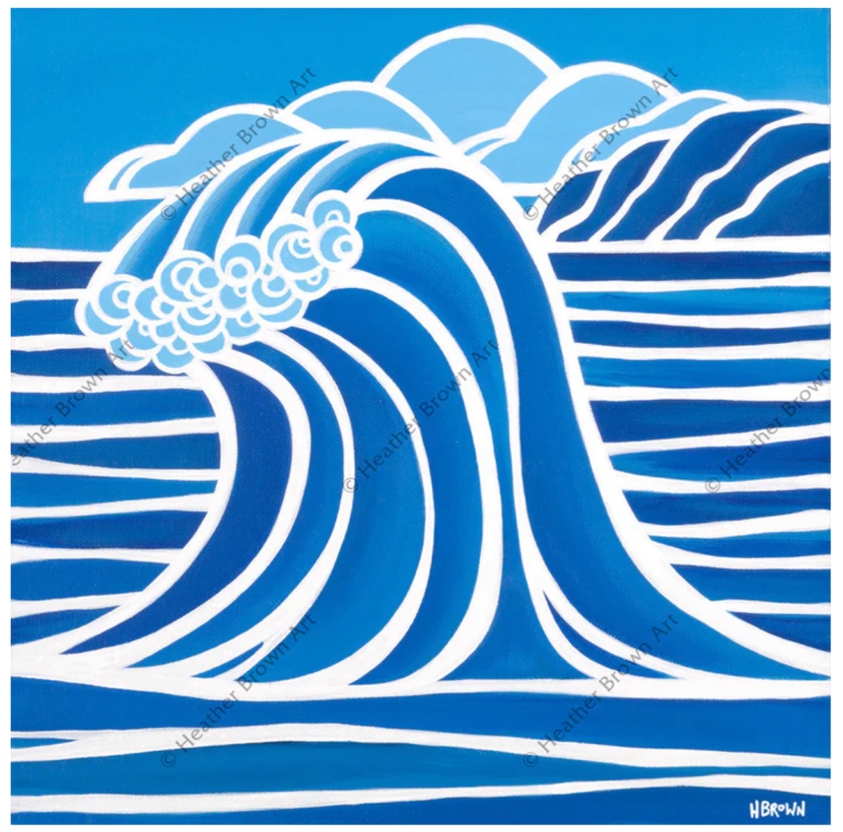 ハワイのサーフアーティスト、ヘザー・ブラウンは、深いブルーの色合いを通して、巨大な波が打ち寄せる完璧なサーフィンの日を描き出しています。本作は、ヘザーの「Shades of Hawaii」シリーズの第9弾です。この作品のクールで落ち着いた色彩は、静かな海を想起させます。オープンエディションのプリントは、単品または9枚セットでご購入いただけます。
