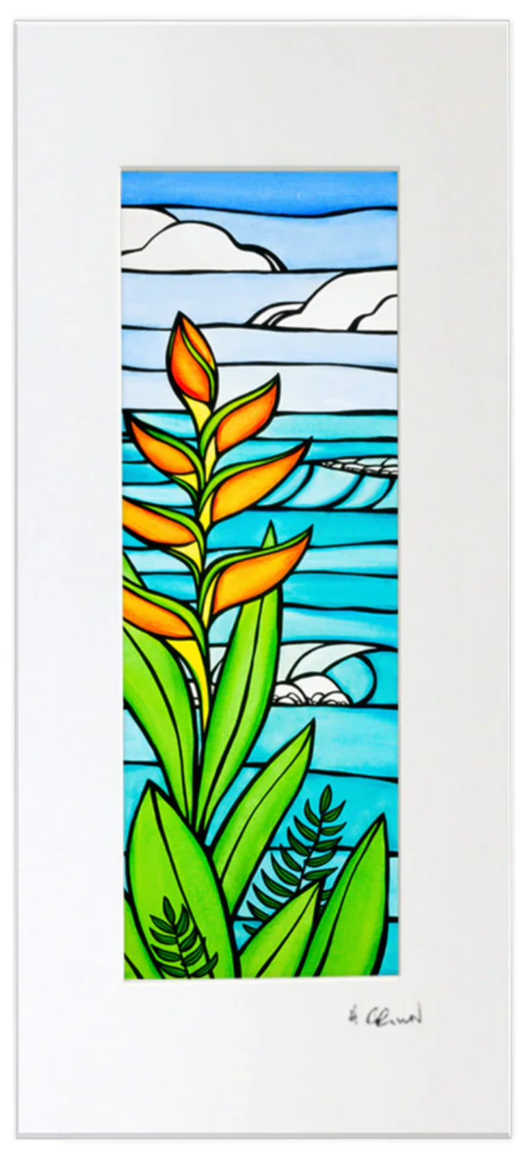 ヘリコニアの花に囲まれた美しい海の景色を描いた、ヘザー ブラウンによるマット加工のアートワークです。