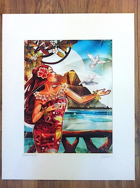 キャット・リーダー著「マカナ・ブリーズ」 11x14 ジクレー紙マットプリント。 紙にジクレープリントされ、11x14 または 16x20 のフレームに収まるようにマット加工されています。 画像サイズ: 8x10 または 11x14。 オープンエディション。 **梱包および発送までに 2 ~ 4 週間ほどかかる場合がありますのでご了承ください。