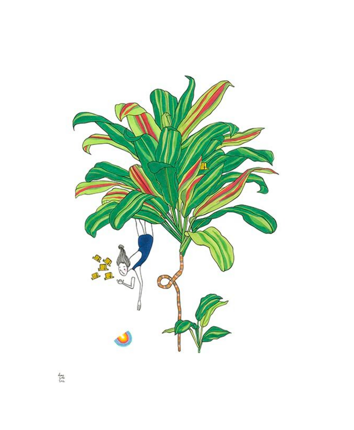 「FORAGE」は、現在制作中の「Natural Habitat」シリーズの作品の一つです。このシリーズは「家」という概念を探求しています。「FORAGE」は、虹を集める人、収穫する人、そして収集家である女性、幸子が、キビの実のチョウチョウウオの導きで、ティの葉の下に隠された見つけにくい虹を見つける世界を描いています。幸子は他の作品「9 to 5」と「Rainbow Diver」にも登場しています。