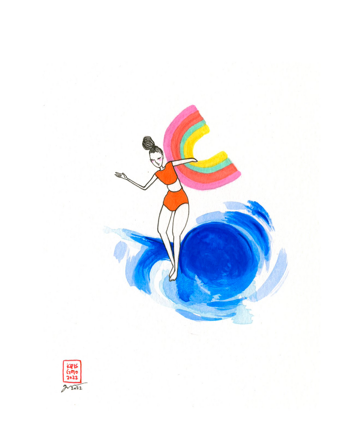 「ハッピーキャッチ!」は、2022年のハレイワ・アーツ・フェスティバルで初公開されたマニニ・シリーズの作品です。ハレイワ・アーツ・フェスティバルは、アーティストが2015年から毎年参加している野外フェスティバルです。このシリーズは、アーティストにとって初の水彩画シリーズでもあります。それぞれの作品は、彼女がこれまで海と築いてきた、あるいは現在も築いている関係性を探求しています。