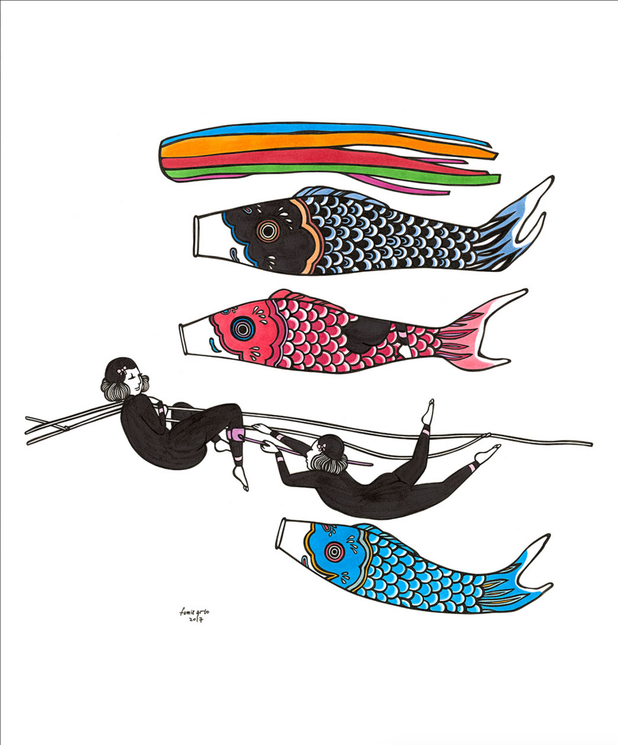 「Koi」は、2017年に横浜でデビューした作品の一つです。日本の春の伝統行事である鯉のぼりからインスピレーションを得ており、通常は子供の日(5月上旬)まで続きます。この作品に隠された3人目の人物を見つけられますか?