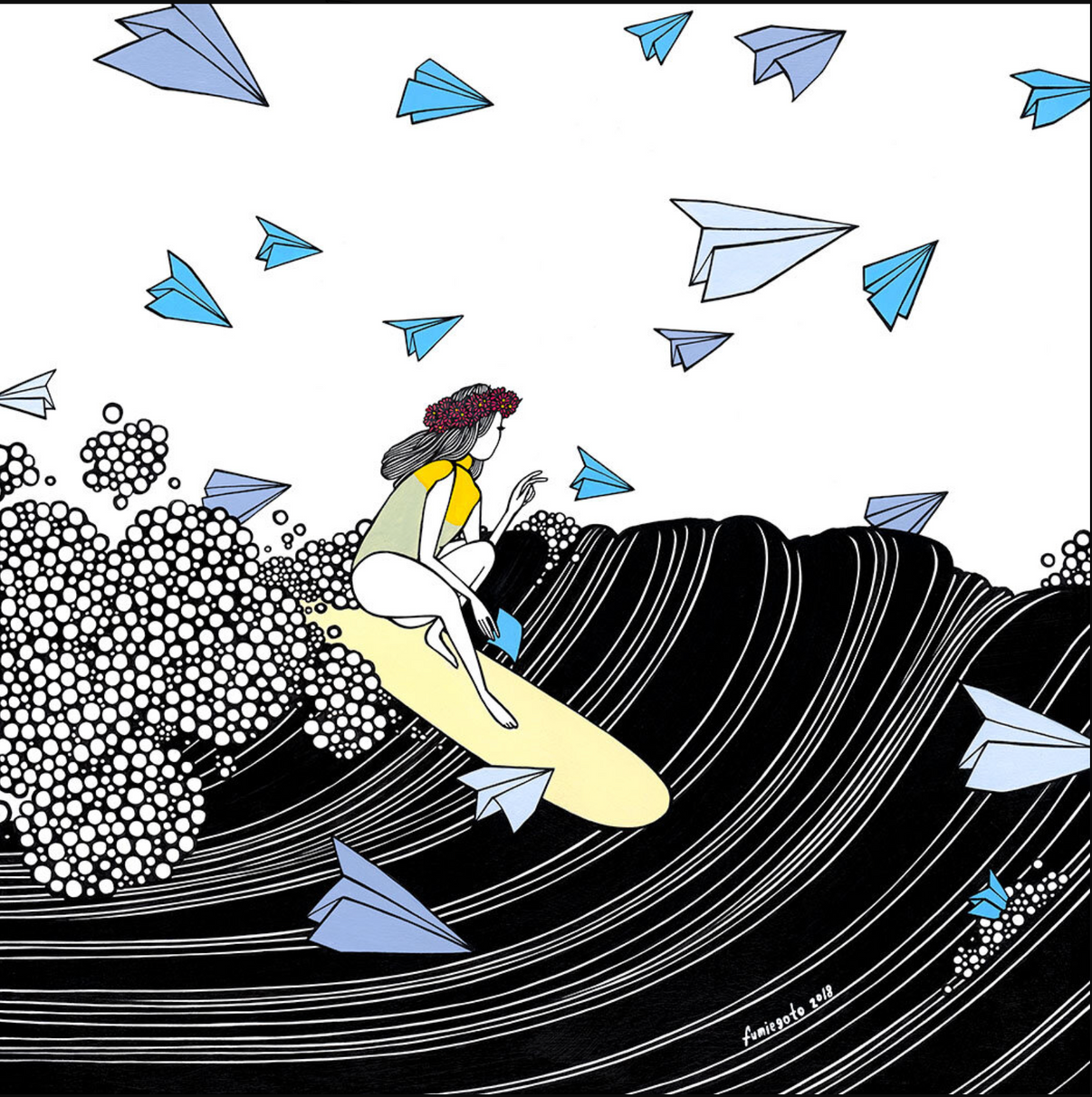 2018年5月に横浜で開催されたグリーンルーム・フェスティバルで初公開された「飛行機、鶴、そして海」シリーズの一つ。日本の伝統である折り紙と、ここハワイのサーフィン文化にインスピレーションを得た作品です。二人のサーファー、鶴と飛行機の友情を中心に、二人が次の波に乗り移るまでの始まりを描いています。決してわだかまりはありません。芽生えることもあれば、枯れることもあります。ただ、また会う日まで、良い思い出を忘れずにいてください!