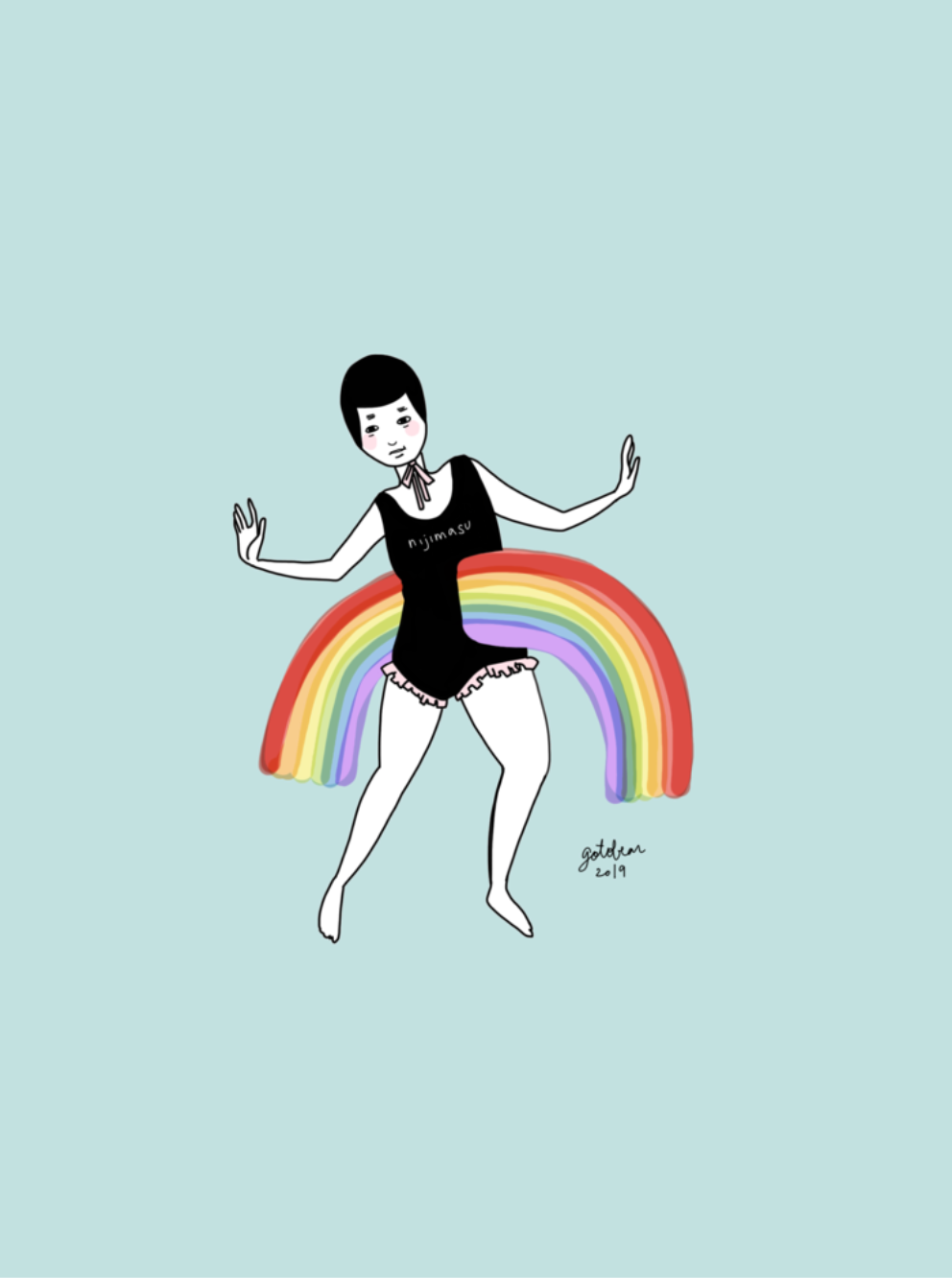 「レインボー・ミンディ」は、アーティストの架空の友人の一人、ミンディにインスピレーションを得た作品です。この友人は、日中虹を見つけると、いつも虹の真ん中に立つのが好きです。これはミンディ・シリーズの作品の一つです。