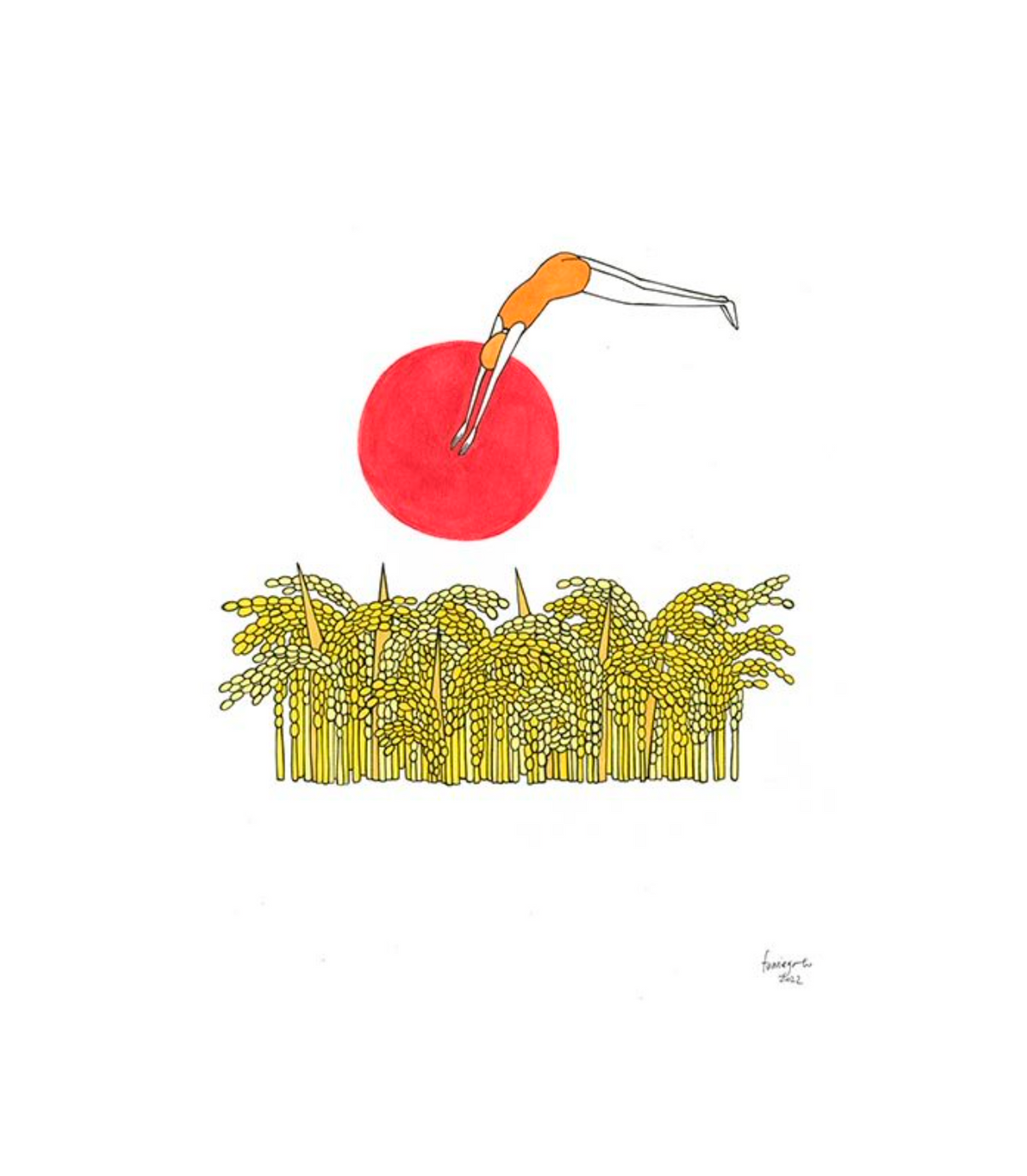 「Rice Dive」は、アーティストの幼少期や文化に根ざした様々なアイテムを探求した「Origin」シリーズの作品です。日本の田んぼの風景、冬に見られる干し柿、銀杏の葉、ししとうなど、日本の様々な季節を象徴するアイテムが描かれています。