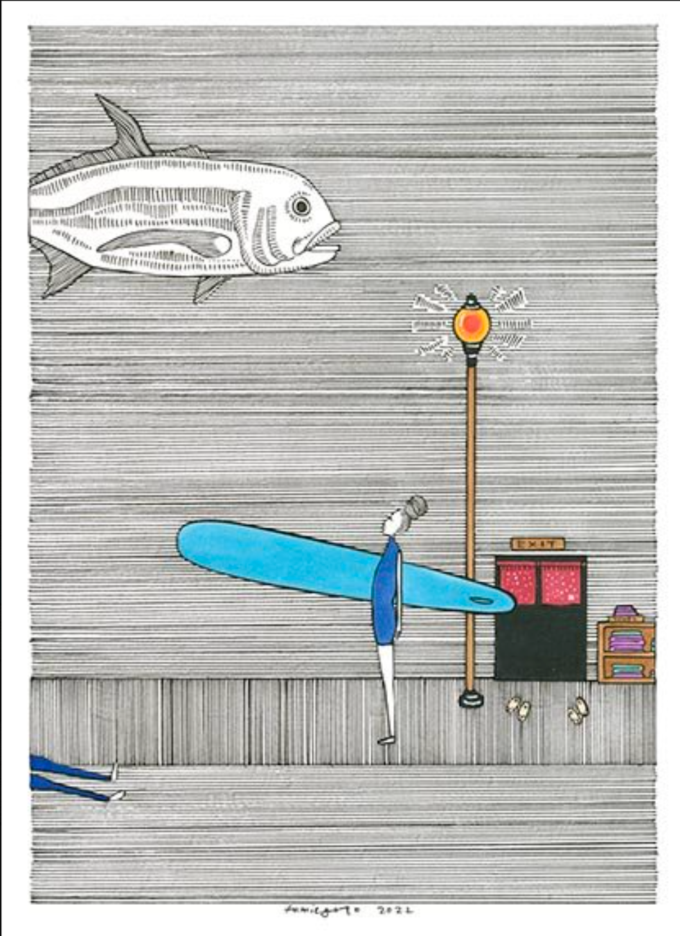 「なぜ彼は牛乳を忘れたのか」は、現在制作中のナチュラルハビタットシリーズの作品の一つです。このシリーズは「家」という概念を探求しています。また、「牛乳は買ったの?」と対をなす作品でもあります。田中さんが仕事から帰宅すると、妻が「帰り道に牛乳を買ってきてくれた?」と声をかけます。この作品は、彼が牛乳を忘れた理由を、ただ単に彼の世界に入り込んでサーフィンをしていた迷子のサーファーを助けることで表現しています。