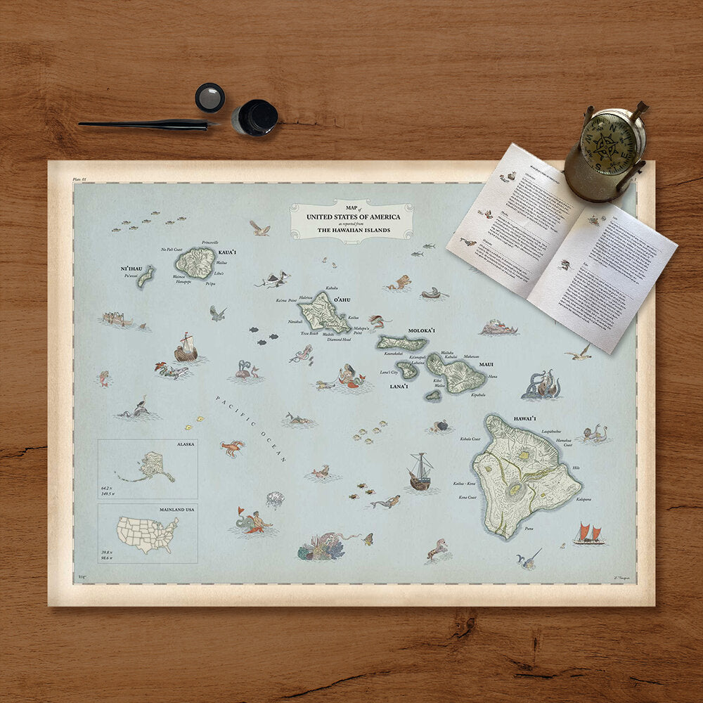 ローレン・トランマー・アート マット/フレームに収まるように 1 インチのボーダーが付いた 22 x 30 インチのアーカイブ ジクレー プリント。限定版75部のみ、署名入り、番号入り。 マップ内で見つかった要素に関連するストーリーの用語集が含まれています。 *画像をクリックするとプリント全体が表示されます* プリントのサイズにより、プリントの取り扱い説明書とともに巻いてチューブに入れて発送されます。 発送まで2~3週間かかります。マハロ!