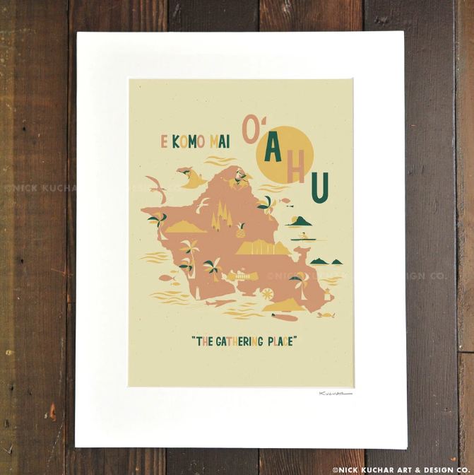 このオアフ島の地図には、レアヒ(ダイヤモンドヘッド)、真珠湾など、「集いの地」のお気に入りのスポットがいくつか描かれており、雄大なコオラウ山脈がスタイリッシュな地図デザインに表現されています。さあ、コモ・マイ!