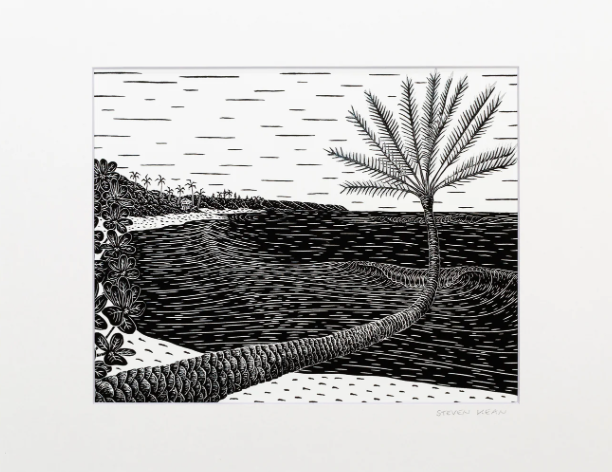 サンセットビーチのヤシの木は樹齢100年以上と言われています。地球上で最も写真に撮られているヤシの木の一つでもあります。キーンはこの作品で、自分の得意分野から一歩踏み出しました。作品の技術的な側面をさらに高めているのは、黒インクの層の上にグレーインクで刷り込んだ二つ目の版木を彫り込んだことです。
