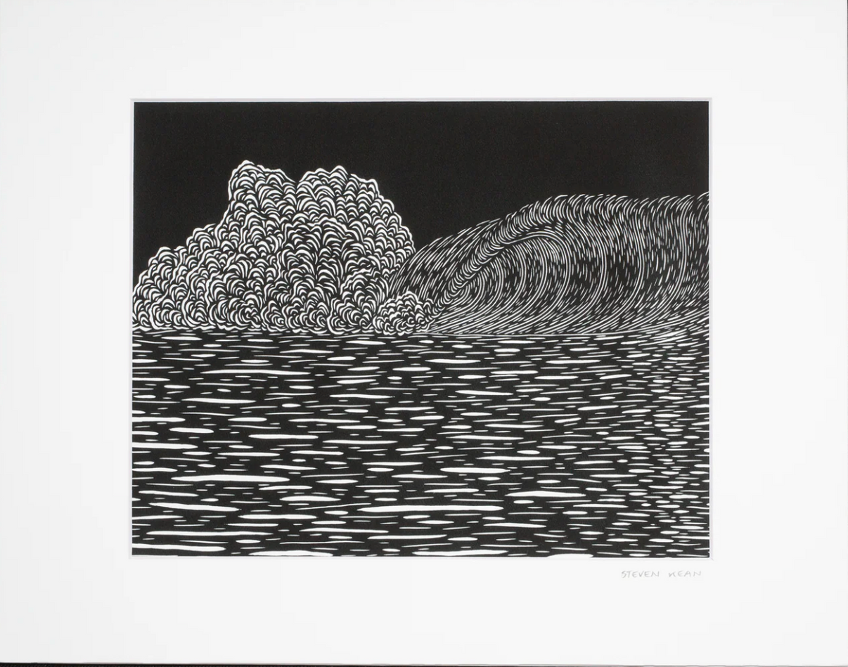 この作品では、キーンは様々な線を丹念に彫り込み、滑らかな波面と砕ける白波のコントラストを表現しています。オリジナルの木版画のサイズは22インチ×30インチです。