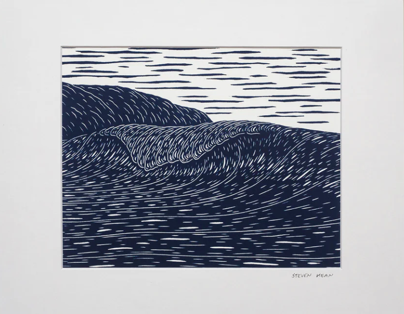 この木版画で、キーンはAフレーム、つまりどちらの方向にもきれいに波を描こうとしています。彼は数種類のインクを混ぜて藍色を作り出し、彼の定番である白黒の形式とは微妙な変化を加えました。