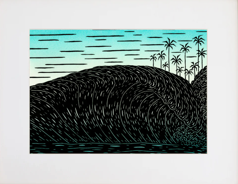 この作品でキーンは、70年以上にわたり冒険家を魅了してきたサーフィンのフロンティア、インドネシアを彷彿とさせる波を描いています。スティーブ自身は一度もその地を訪れたことはありませんが、その夢を現実にしようと心に決めています。「インド」の制作は、彼の意志の足がかりであり、自宅スタジオの新しい印刷機から生み出される初めての版画となります。この作品は、木版画と色をブレンドしたモノプリントという2つの版画技法を用いて制作されました。青の微妙なグラデーションを表現することは、キーンにとって最も困難でありながらやりがいのあるプロセスの一つであり、彼の版画技法における頼もしいツールとなっています。