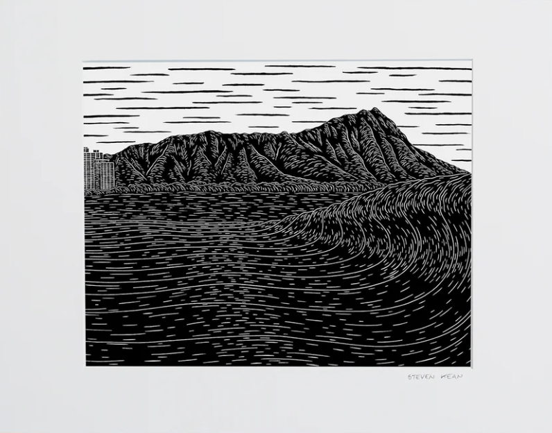 ハワイで最も有名なランドマークであるレアヒ(ダイヤモンドヘッド)は、30万年前に形成されたと考えられています。頂上がアヒの額に似ていることから、女神ペレの妹であるヒイアカがレアヒと名付けたと言われています。キーンは、この象徴的な景色を木版画で表現しています。