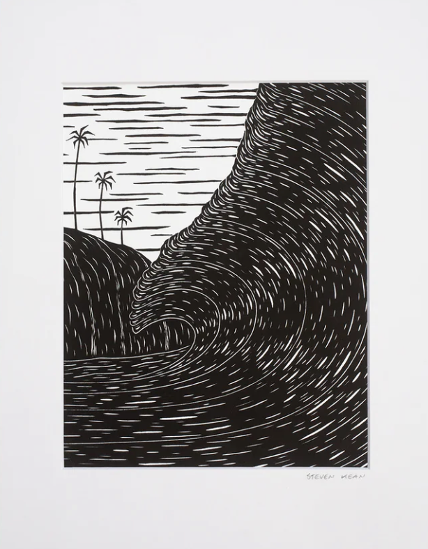 カウアイ島の北西部には、自然が生み出した壮大な景観の一つ、ナ・パリ・コーストがあります。ハワイ語で「ナ・パリ」とは文字通り「多くの崖」を意味します。この木版画で、キーンは砕ける波の隙間からナ・パリを眺めた風景を描いています。