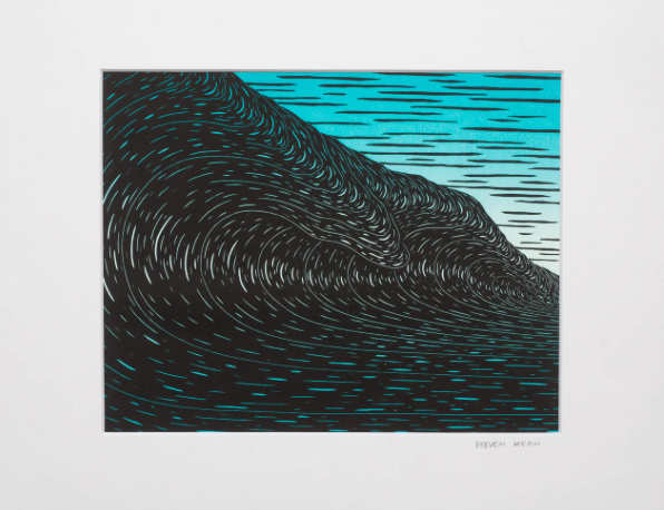 オアフ島ノースショアは、キーンにとって常にインスピレーションの源です。この木版画では、オアフ島北岸で最も危険な波の一つとして知られる、悪名高いショアブレイク「ケイキ」を、キーン自身による2度目の作品として捉えています。