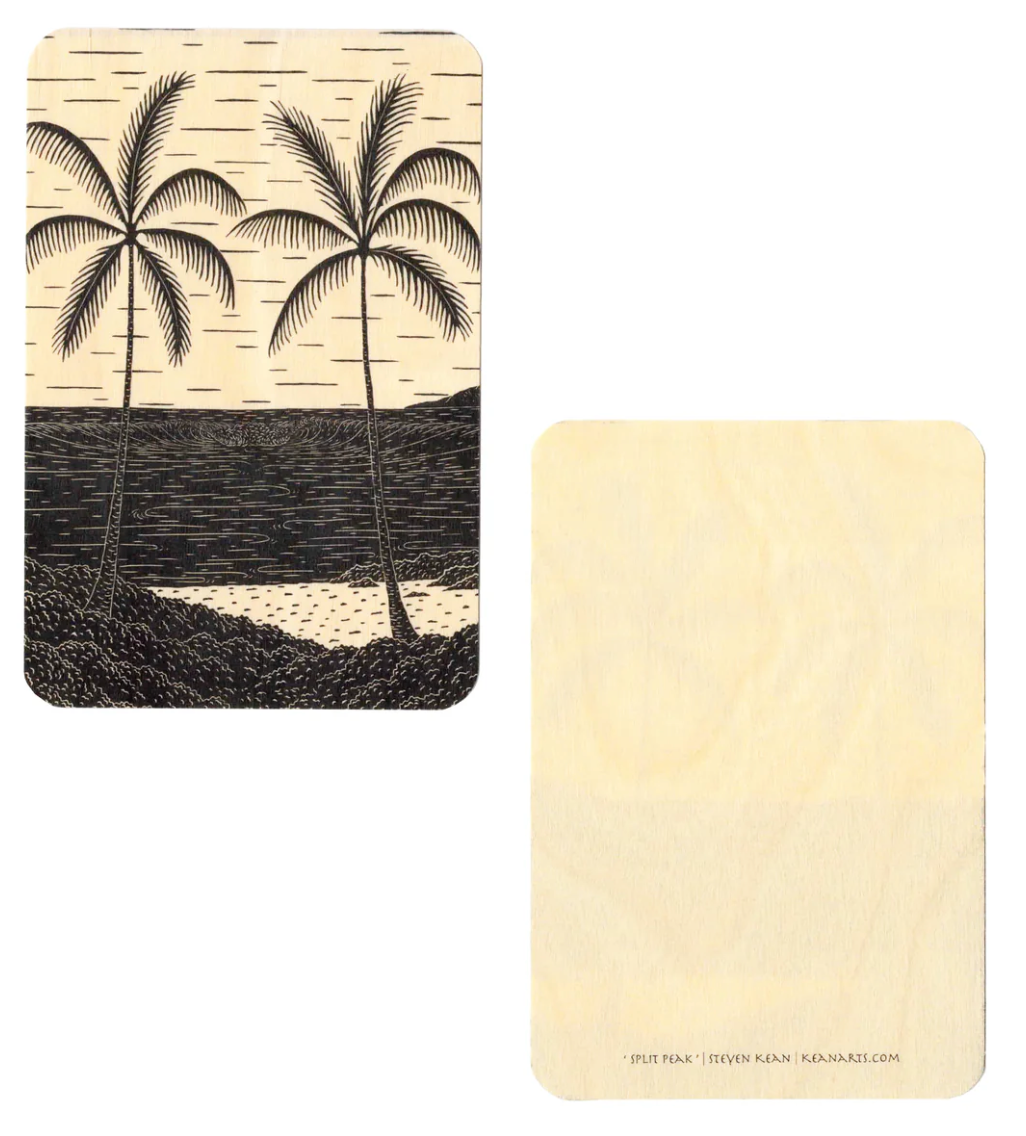 本物の木にプリントされた画像。ポストカードとして郵送できるほど軽量で、額装するとさらに美しく見えます。誕生日や特別な日のカード、サイドテーブルのアクセントなど、様々な用途でご愛用いただいています。ハワイ州オアフ島ノースショアでアロハの気持ちを込めてデザインしました。白黒画像はバーチウッドに印刷されています