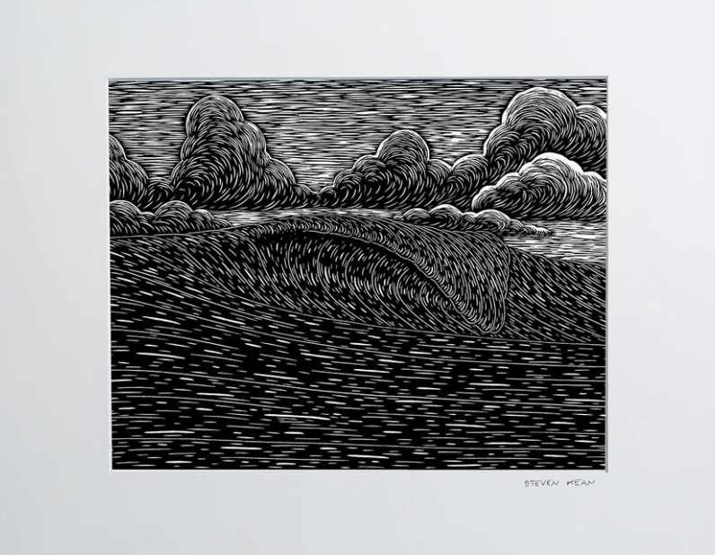 この木版画で、キーンは完璧に砕ける波と、うねる積乱雲を巧みに組み合わせています。作品全体に躍動感が漂います。これは、滑らかで流れるような線を丁寧に木に彫り込むことで実現されています。鋭い彫金と安定した手作業が、その道を導きます。