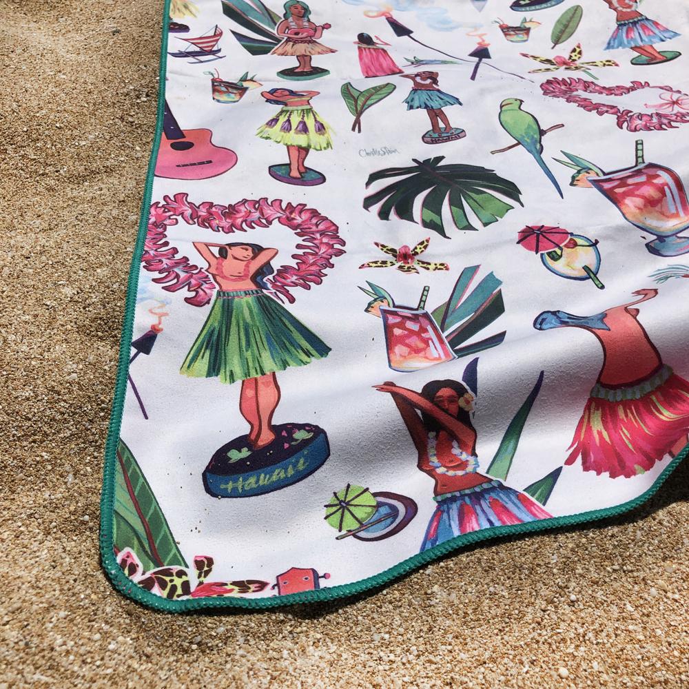 SURFER TOWELは、地元ハワイのアーティスト、クリスティ・シン氏とコラボレーションし、「フラドール」を制作しました。ミッドセンチュリー・ワイキキの伝統的なお土産をセレクションしたコレクションです。一つ一つのアイテムは、アーティストによる手描きとデジタルアレンジで仕上げられています。背面の模様は、草のスカートを抽象的に表現しています。腰に巻いて、ヒップを揺らしてみましょう!