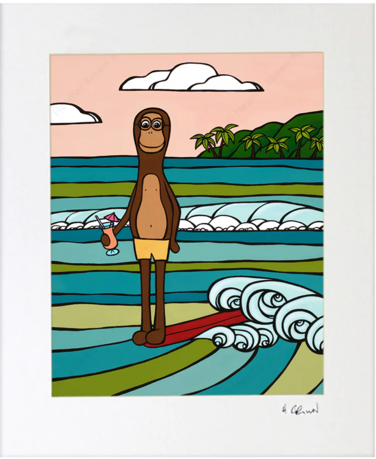 遊び心のあるサルとワイキキの波 - マットアートプリント 「フランシスというお猿は、靴を脱いでワイキキの夜を楽しむのが大好きです!」 - H. ブラウン トロピカルドリンクを片手に波乗りを楽しむ、遊び心のあるサルの鮮やかな描写。ヘザー・ブラウンによるハワイのトロピカルアート作品は、ご自宅のインテリアに安らぎと喜びをもたらします。 オアフ島ノースショアのサーフアーティスト、ヘザー・ブラウンによるマットプリント。エンボス加工のマット付きで、再生紙とサトウキビ紙を使用しています。裏面にはアーティストの略歴が添えられており、3サイズからお選びいただけます。プリントに合わせて、様々な色を取り揃えた手作りのフレームをご用意しております。お客様のインテリアニーズに合わせてお選びいただけます。フレームの製作には、可能な限り再生木材やリサイクル木材を使用するよう努めています。 紙にジクレー印刷 マットサイズ: 8 x 10インチ / 約30.5 × 30.5 cm 11 x 14インチ / 約27.9 x 35.6 cm 16 x 20インチ / 約40.6 x 50.8 cm 額装サイズ: 8x10インチプリント:12.75 x 14.75インチ / 約32.4 x 37.5 cm 11x14インチプリント:15.75 x 18.75インチ / 約40 x 47.6 cm 16x20インチプリント:20.75 x 24.75インチ / 約52.7 x 62.9 cm...