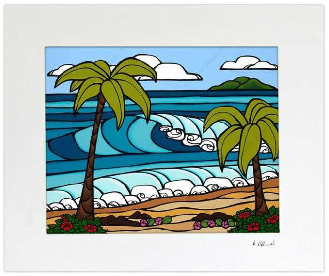 ハワイの夏の日に、太陽が輝くビーチに打ち寄せるうねる波を描いた、ヘザー・ブラウンによるマット加工のアートワーク。オアフ島ノースショアのサーフアーティスト、ヘザー・ブラウンによるマット加工のプリントです。