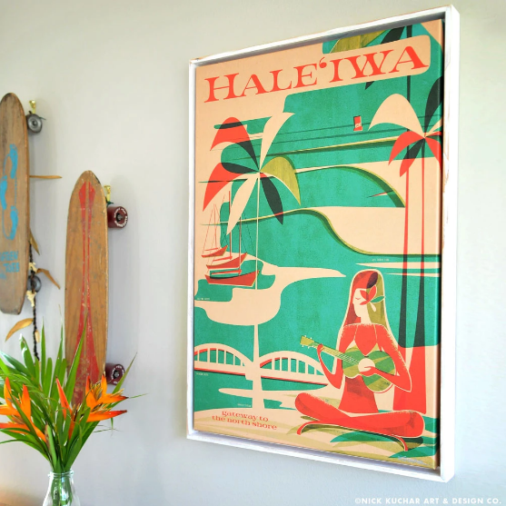 このキャンバスラップジクレー(ジクレーとは「非常に美しいファインアートインクジェットプリント」を意味する専門用語です)は、厚手のアーカイブキャンバスにデジタル印刷され、厚さ1.5インチの丈夫な木製バーに張られています。プリント全体を覆う透明ラミネート加工も施されています。キャンバスラップには、オアフ島産の再生木材で手作りされた白いフローティングフレームが付属しています。背面の金具を使ってキャンバスを吊るすだけで、簡単に作品を飾ることができます。*当社の再生木材フレームはどれも、素材の特性により一つ一つがわずかに異なります。写真とは多少異なる場合があります。