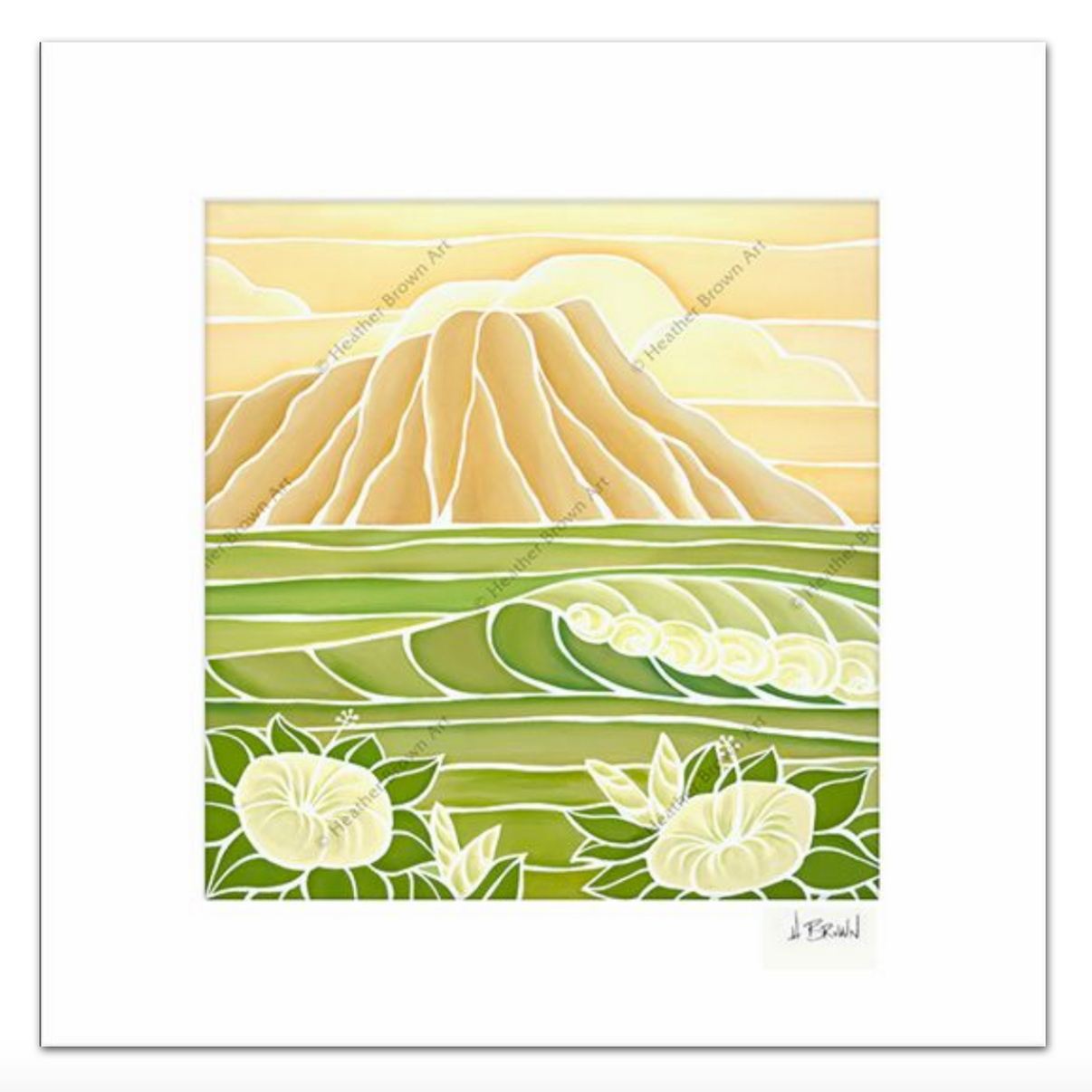 ハワイの夏の日に、太陽が輝くビーチに打ち寄せるうねる波を描いた、ヘザー・ブラウンによるマット加工のアートワーク。オアフ島ノースショアのサーフアーティスト、ヘザー・ブラウンによるマット加工のプリントです。