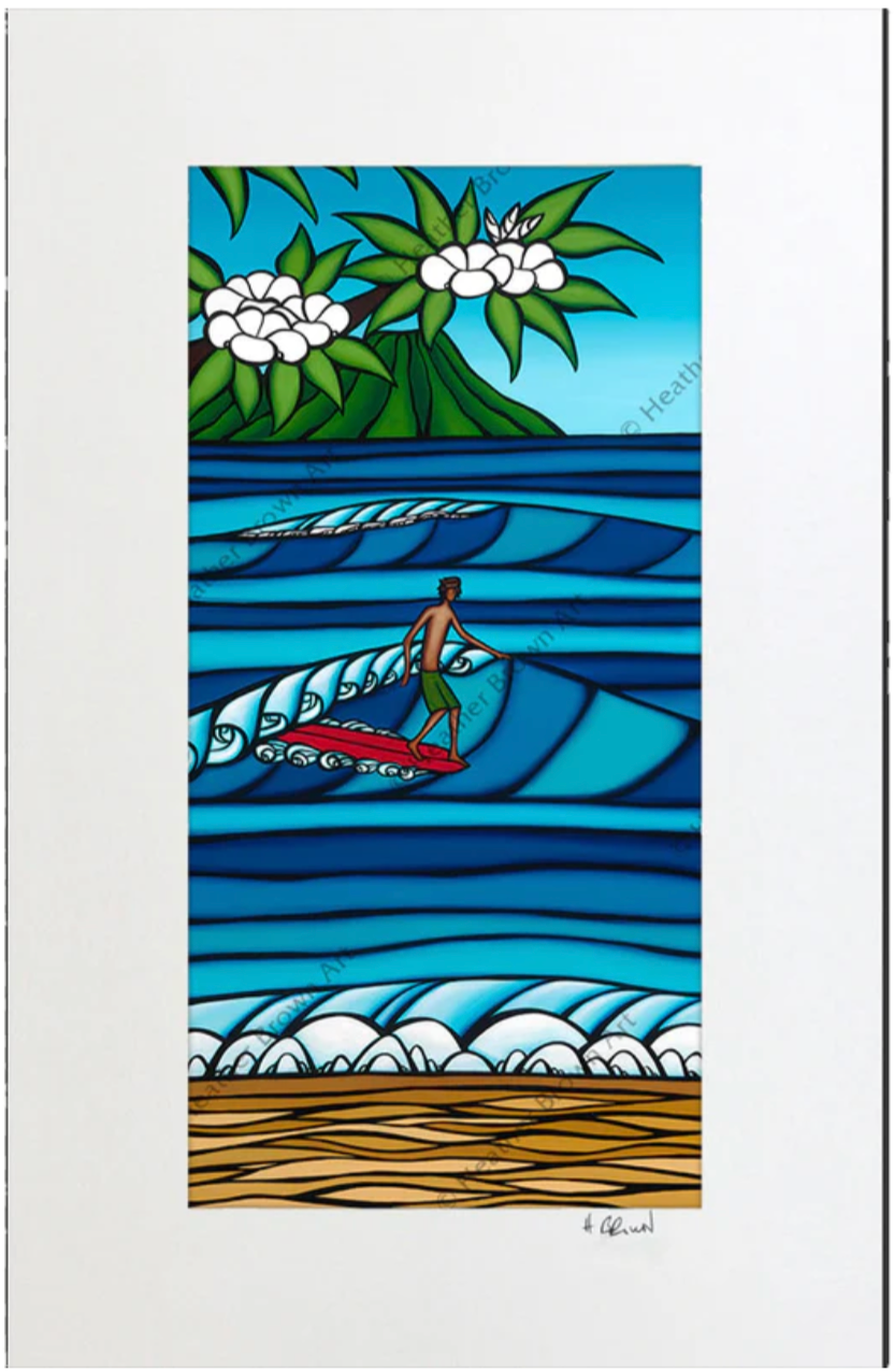 ハワイのホノルル沖で壮大な波に乗るサーファーを描いた、ヘザー ブラウンによるマット加工のアートワーク。 オアフ島ノースショアのサーフアーティスト、ヘザー・ブラウンによるマットプリント。エンボス加工のマット付きで、再生紙とサトウキビ紙を使用しています。裏面にはアーティストの略歴が添えられており、3サイズからお選びいただけます。プリントに合わせて、様々な色を取り揃えた手作りのフレームをご用意しております。お客様のインテリアニーズに合わせてお選びいただけます。フレームの製作には、可能な限り再生木材やリサイクル木材を使用するよう努めています。