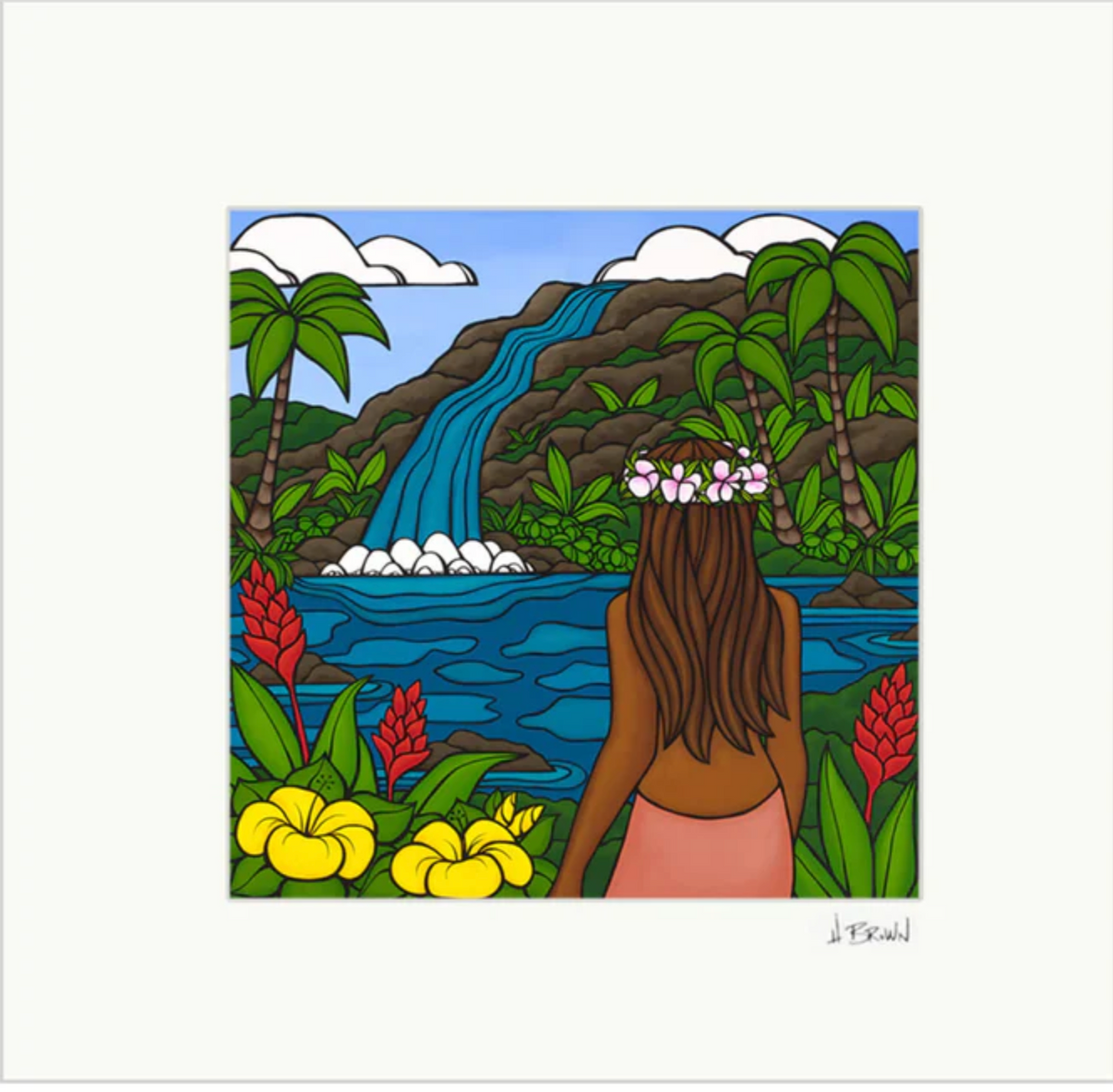 女性、熱帯の花、そして滝 - マットアートプリント このプリントにはエンボス加工のマットが付属し、再生紙とサトウキビ紙で制作されています。裏面にはアーティストの略歴が添えられており、3つのサイズからお選びいただけます。 プリントに合わせて、様々な色を取り揃えた手作りのフレームをご用意しております。お客様のインテリアニーズに合わせてお選びいただけます。フレームの製作には、可能な限り再生木材やリサイクル木材を使用するよう努めています。紙にジクレー印刷 * 梱包および発送までに最大 3 週間ほどかかる場合がありますのでご了承ください。 ***実際のフレームの色やサイズはサンプル画像と異なる場合があります。