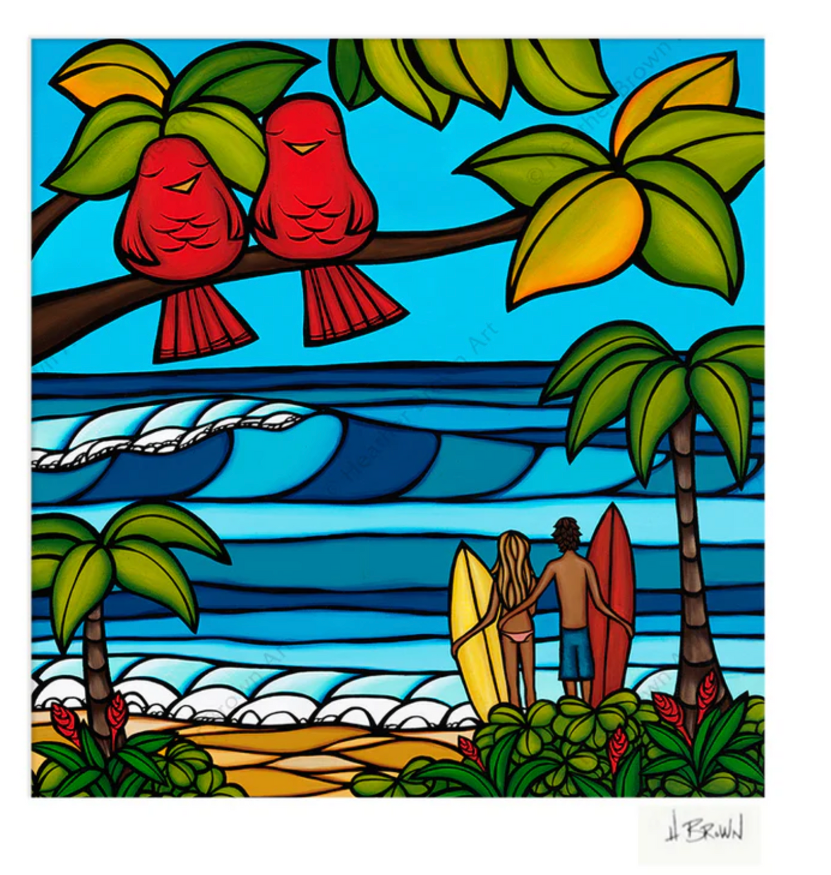 サーフィンデートのカップル - マットアートプリント このプリントにはエンボス加工のマットが付属し、再生紙とサトウキビ紙で制作されています。裏面にはアーティストの略歴が添えられており、3つのサイズからお選びいただけます。 プリントに合わせて、様々な色を取り揃えた手作りのフレームをご用意しております。お客様のインテリアニーズに合わせてお選びいただけます。フレームの製作には、可能な限り再生木材やリサイクル木材を使用するよう努めています。紙にジクレー印刷 * 梱包および発送までに最大 3 週間ほどかかる場合がありますのでご了承ください。 ***実際のフレームの色やサイズはサンプル画像と異なる場合があります。