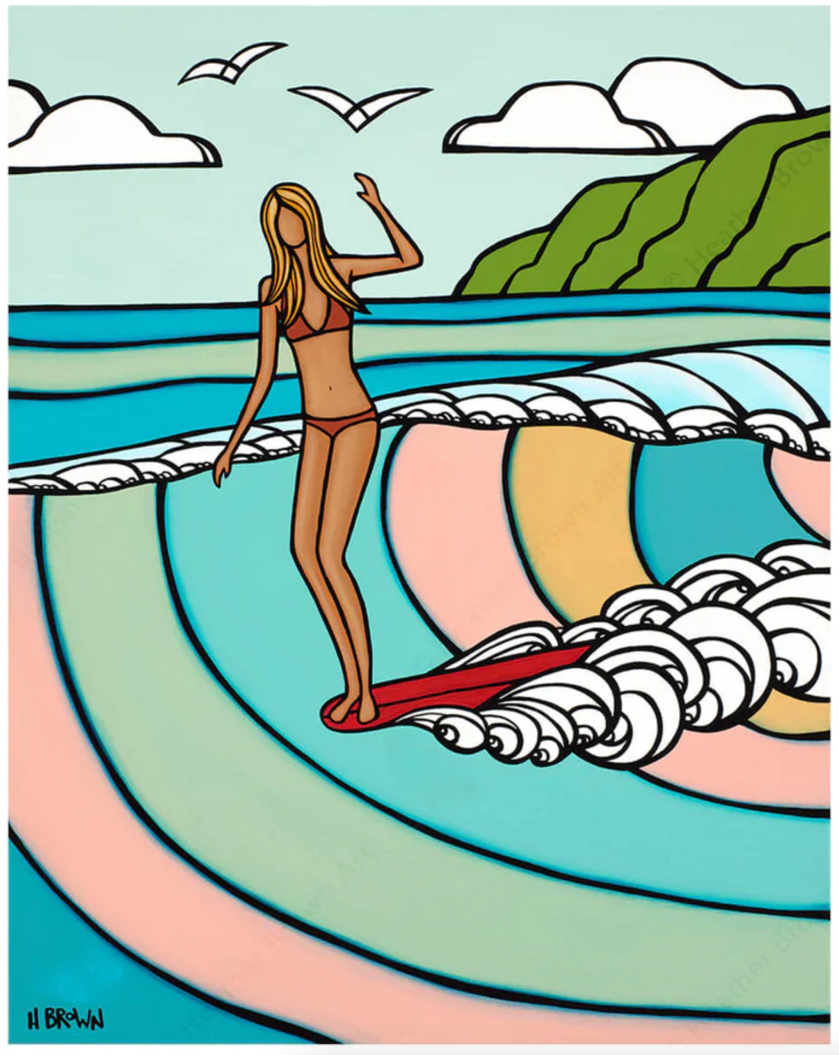 パステルウェーブに浮かぶハワイのサーファーガール - 限定版キャンバスアートプリント