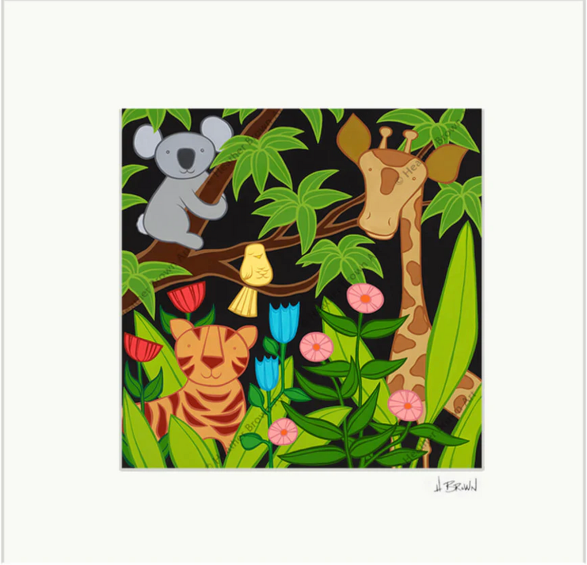 遊び心のあるジャングルの動物と熱帯林 - マットアートプリント