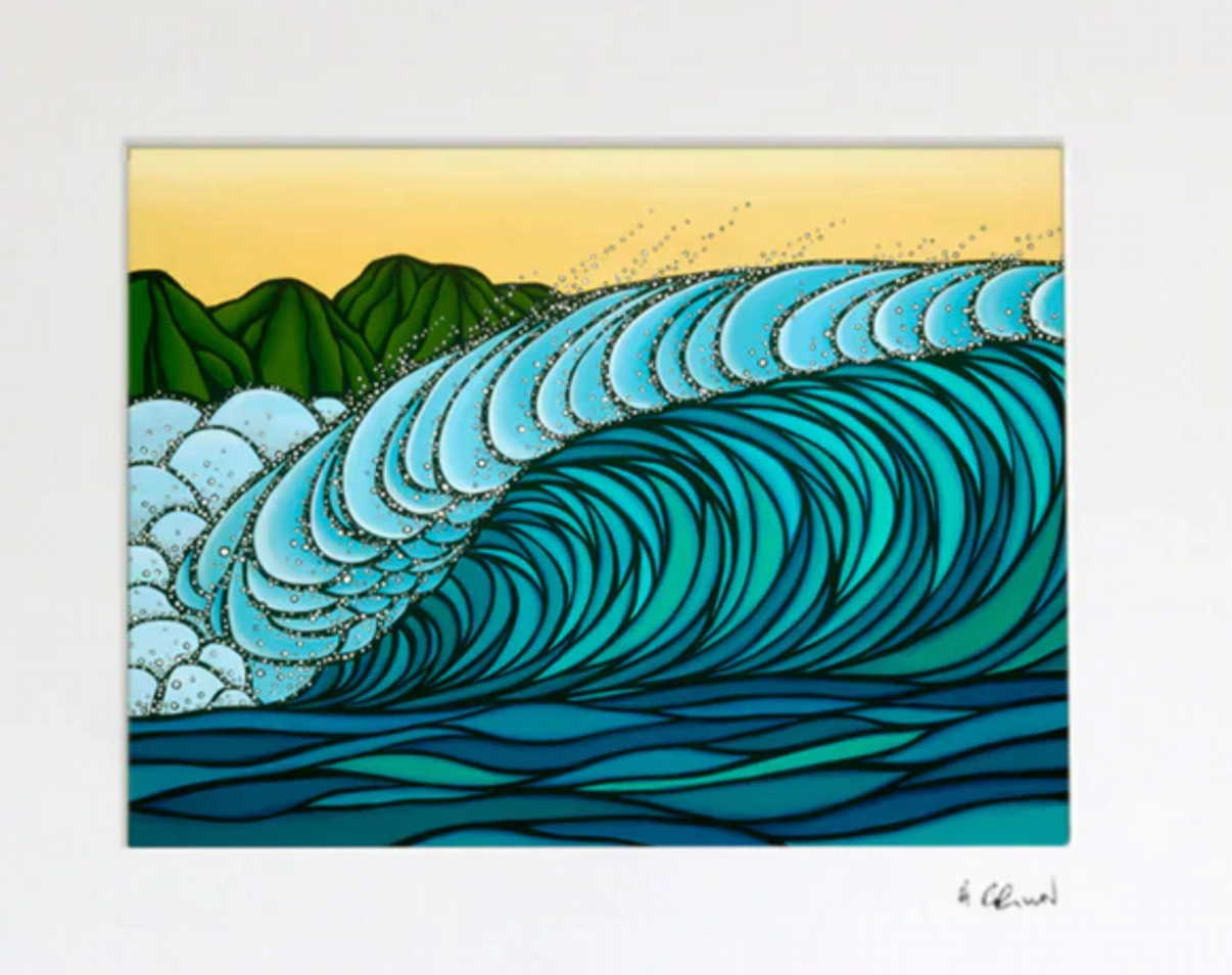 鮮やかなティールウェーブサーフアート - マットアートプリント 「この作品は、オアフ島ノースショアで壮大なビッグウェーブサーフィンを実現する、冬の巨大な波と完璧なオフショア風のコンディションを私の解釈で表現したものです。」 - H.ブラウン 大胆な青い波と遠くの緑の山々を描いた、ヘザー ブラウンによるマット紙プリントのアートワーク。 このプリントにはエンボス加工のマットが付属し、再生紙とサトウキビ紙で制作されています。裏面にはアーティストの略歴が添えられており、3つのサイズからお選びいただけます。 プリントに合わせて、様々な色を取り揃えた手作りのフレームをご用意しております。お客様のインテリアニーズに合わせてお選びいただけます。フレームの製作には、可能な限り再生木材やリサイクル木材を使用するよう努めています。紙にジクレー印刷マットサイズ: 8 x 10インチ / 約30.5 × 30.5 cm 11 x 14インチ / 約27.9 x 35.6 cm 16 x 20インチ / 約40.6 x 50.8 cm額装サイズ: 8x10インチプリント:12.75 x 14.75インチ / 約32.4 x 37.5 cm 11x14インチプリント:15.75 x 18.75インチ / 約40 x 47.6 cm 16x20インチプリント:20.75 x 24.75インチ / 約52.7 x 62.9 cm 11x14インチのプリント、バーンウッドフレーム付き:14.5 x...
