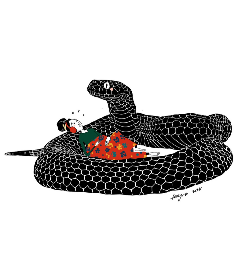 「蛇」は、中国占星術で蛇の年である2025年を祝うものです。蛇と少女は一体です。蛇は少女の内なる自己を表しています。常に意識的で、常に警戒しながらも、完全に安らぎを感じています。この作品は、長所と短所の両方を含め、真の自分を受け入れることについて描いています。