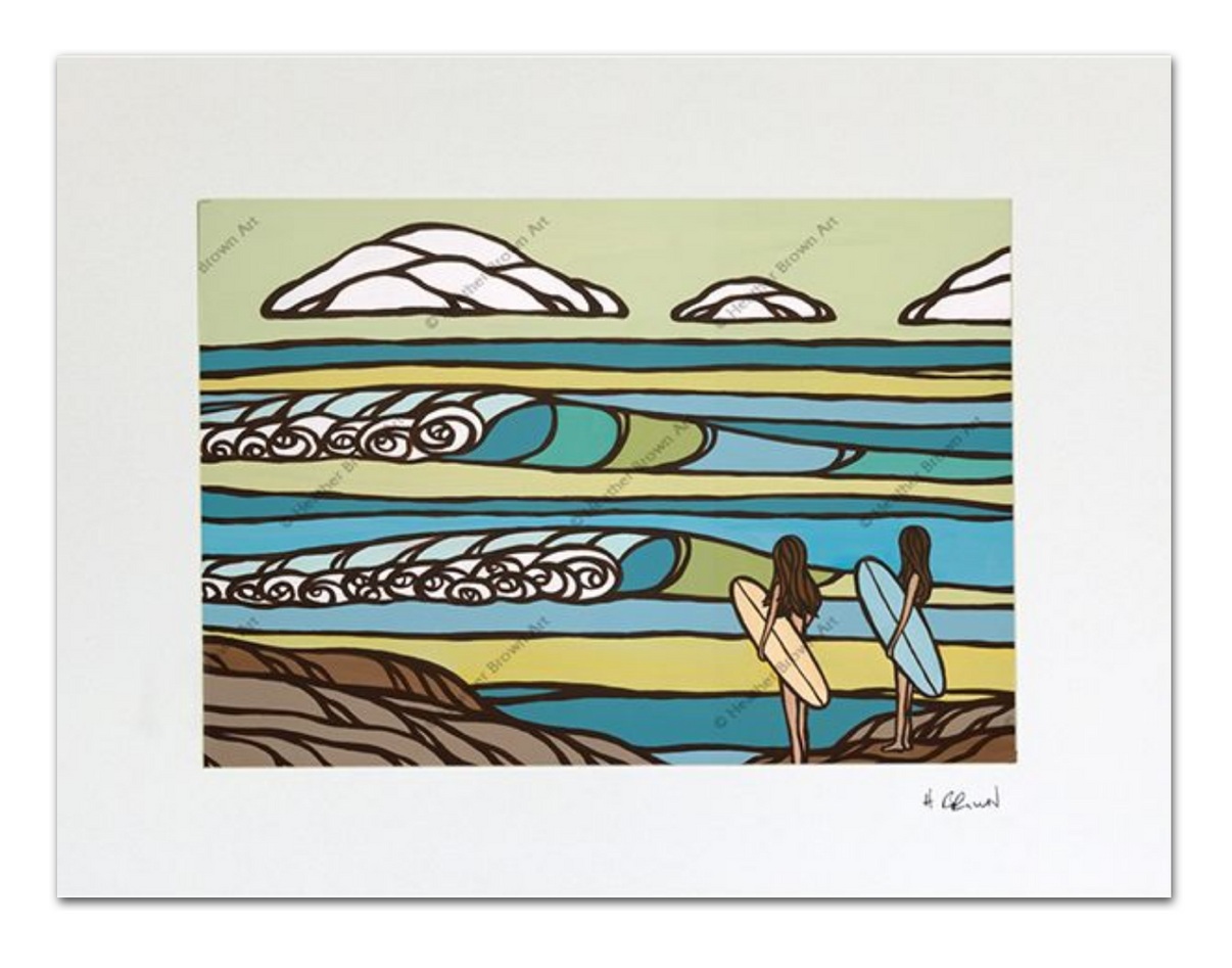 ハワイの夏の日に、明るい太陽が降り注ぐビーチに向かって打ち寄せる波を描いた、ヘザー ブラウンによるマット加工のアートワークです。オアフ島ノースショアのサーフアーティスト、ヘザー・ブラウンによるマットプリント。エンボス加工のマット付きで、再生紙とサトウキビ紙を使用しています。裏面にはアーティストの略歴が添えられており、3サイズからお選びいただけます。プリントに合わせて、様々な色を取り揃えた手作りのフレームをご用意しております。お客様のインテリアニーズに合わせてお選びいただけます。フレームの製作には、可能な限り再生木材やリサイクル木材を使用するよう努めています。