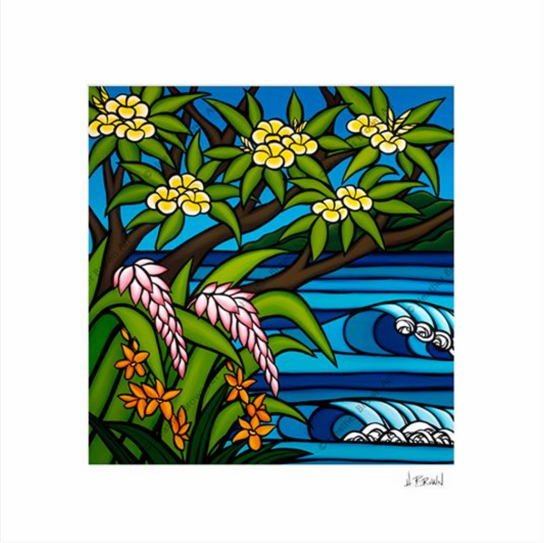 ハワイの夏の日に、明るい太陽が降り注ぐビーチに向かって打ち寄せる波を描いた、ヘザー ブラウンによるマット加工のアートワークです。オアフ島ノースショアのサーフアーティスト、ヘザー・ブラウンによるマットプリント。エンボス加工のマット付きで、再生紙とサトウキビ紙を使用しています。裏面にはアーティストの略歴が添えられており、3サイズからお選びいただけます。 プリントに合わせて、様々な色を取り揃えた手作りのフレームをご用意しております。お客様のインテリアニーズに合わせてお選びいただけます。フレームの製作には、可能な限り再生木材やリサイクル木材を使用するよう努めています。