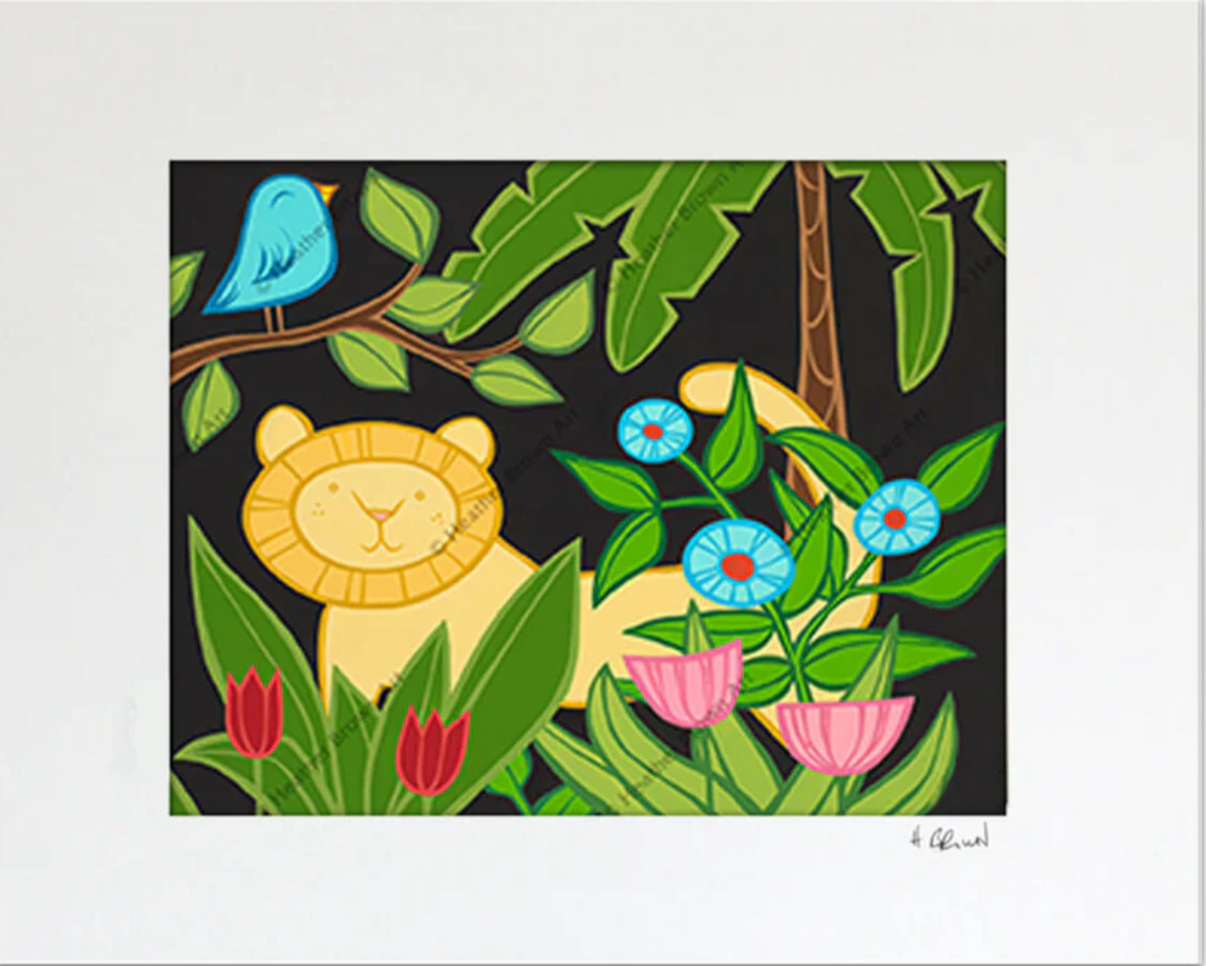 遊び心のあるライオンと熱帯植物 - マットアートプリント 「トロピカル ライオンは、夜間に孤独を楽しむ野生動物を遊び心たっぷりに描いた作品です。」 - H. ブラウン 鮮やかな熱帯植物のコレクション、遊び心のあるライオン、そして黒い夜空を背景にした一羽の青い鳥。ヘザー・ブラウンによるハワイのトロピカルアート作品は、ご自宅のインテリアに安らぎと喜びをもたらします。 このプリントにはエンボス加工のマットが付属し、再生紙とサトウキビ紙で制作されています。裏面にはアーティストの略歴が添えられており、3つのサイズからお選びいただけます。 プリントに合わせて、様々な色を取り揃えた手作りのフレームをご用意しております。お客様のインテリアニーズに合わせてお選びいただけます。フレームの製作には、可能な限り再生木材やリサイクル木材を使用するよう努めています。紙にジクレー印刷 マットサイズ: 8 x 10インチ / 約30.5 × 30.5 cm 11 x 14インチ / 約27.9 x 35.6 cm 16 x 20インチ / 約40.6 x 50.8 cm * 梱包および発送までに最大 3 週間ほどかかる場合がありますのでご了承ください。 ***実際のフレームの色やサイズはサンプル画像と異なる場合があります。