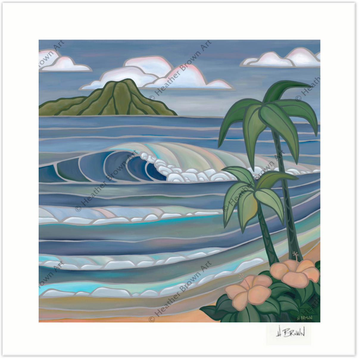 ハワイの夏の日に、明るい太陽が降り注ぐビーチに向かって打ち寄せる波を描いた、ヘザー ブラウンによるマット加工のアートワークです。 オアフ島ノースショアのサーフアーティスト、ヘザー・ブラウンによるマットプリント。エンボス加工のマット付きで、再生紙とサトウキビ紙を使用しています。裏面にはアーティストの略歴が添えられており、3サイズからお選びいただけます。プリントに合わせて、様々な色を取り揃えた手作りのフレームをご用意しております。お客様のインテリアニーズに合わせてお選びいただけます。フレームの製作には、可能な限り再生木材やリサイクル木材を使用するよう努めています。