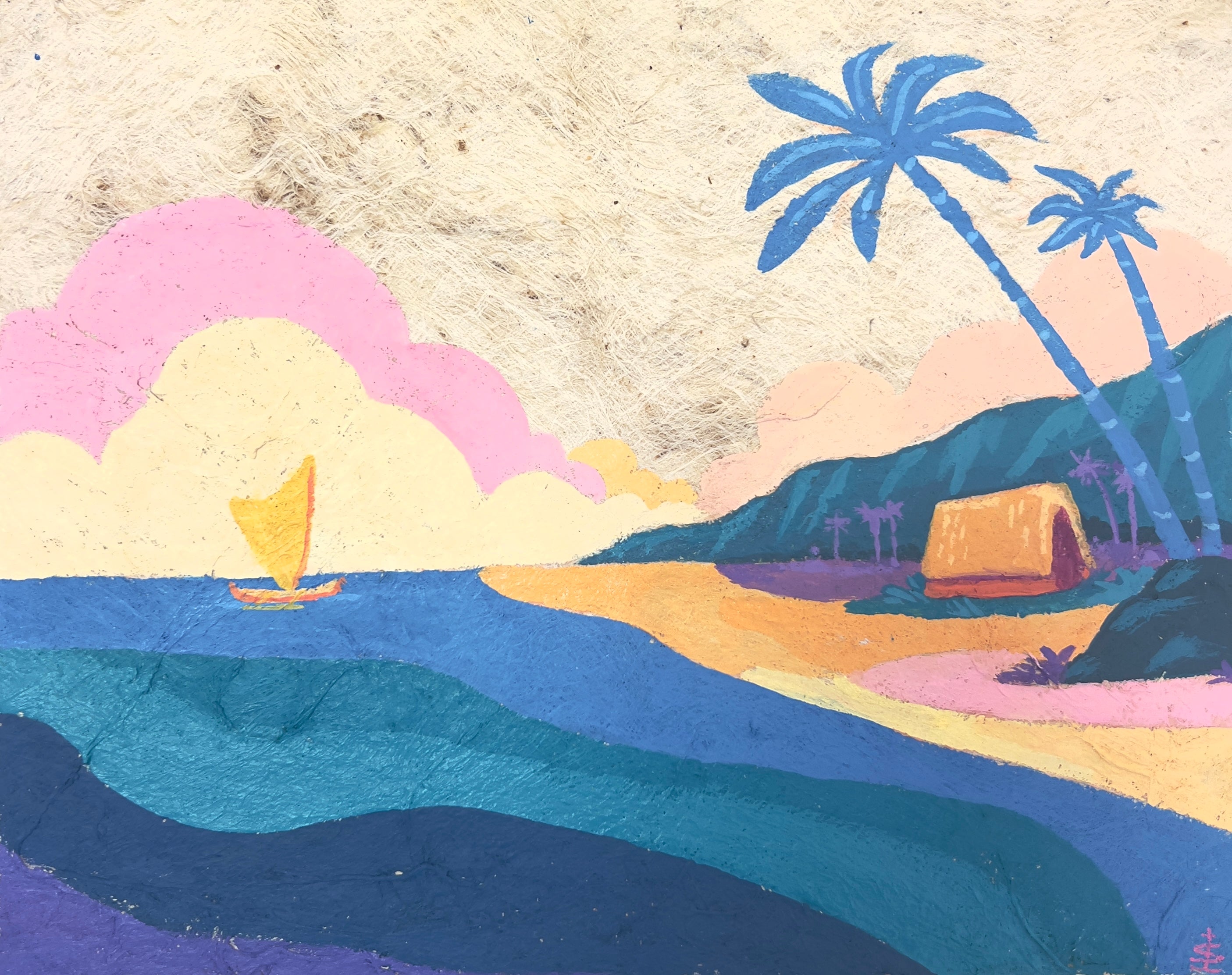 Medium : Acrylic on Handmade Hawaiian Kapa cloth on wood panel