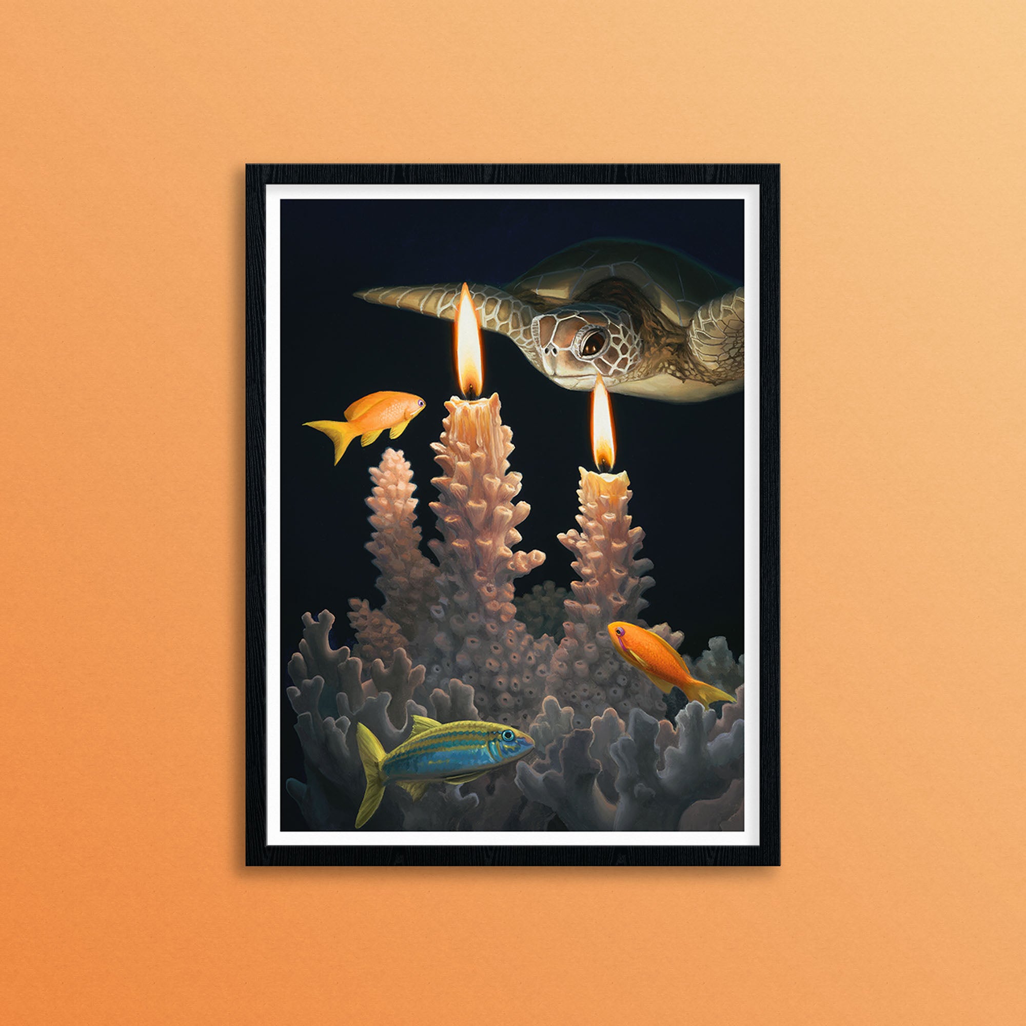 Over the last 2 years, Earth's oceans have experienced a mass coral bleaching event with over 80% of the world’s coral reef area impacted by bleaching-level heat stress. We’ve ignited our oceans and set aflame coral reefs, crucial ecosystems on which 25% of all marine life depends. My piece “Coralabra” comments on human-made climate change, warming waters, and coral bleaching with alarmed sea creatures coming to investigate and help solve the problem, leading the efforts in hopes that humans will follow.